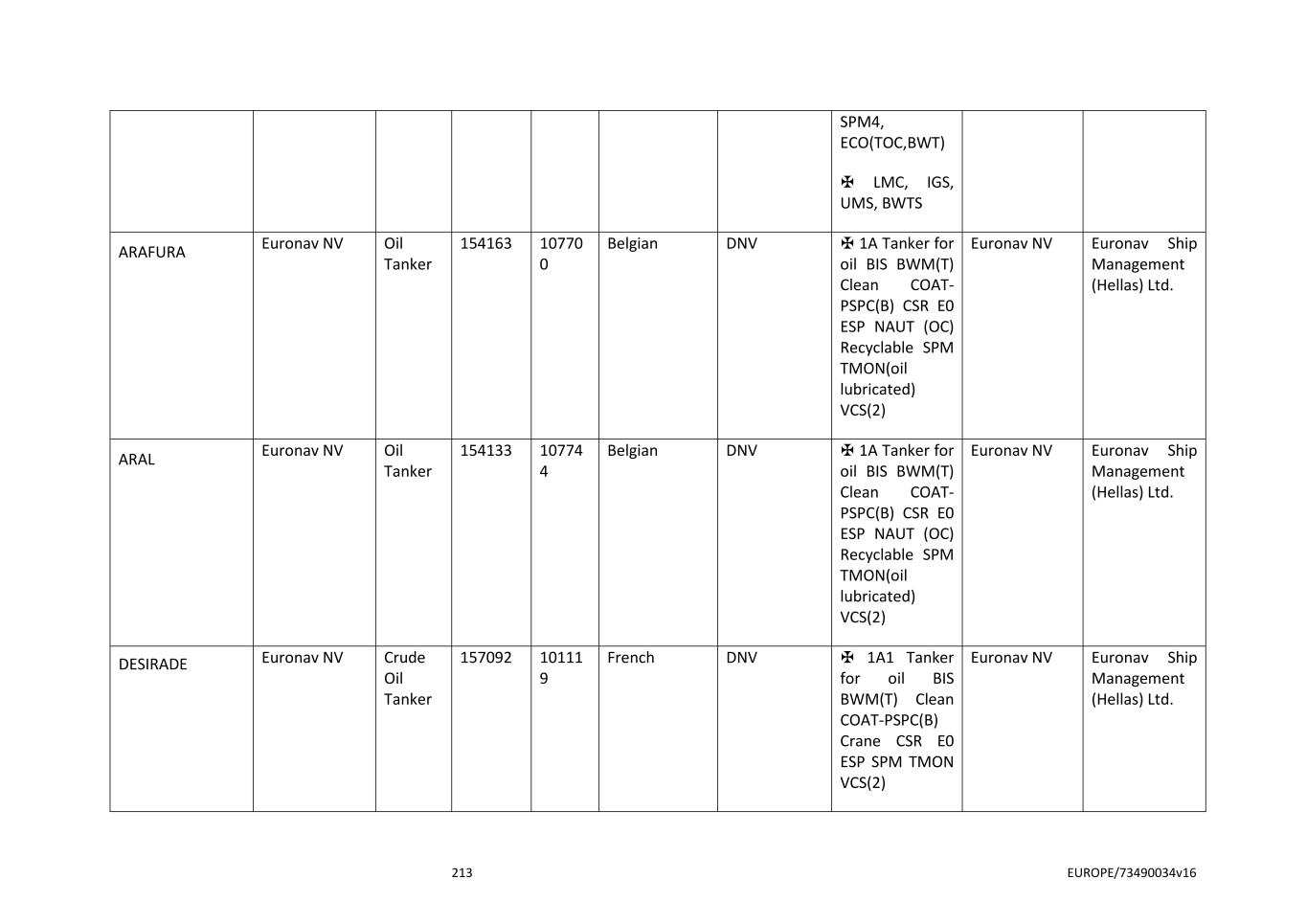 213 EUROPE/73490034v16 SPM4, ECO(TOC,BWT) ✠ LMC, IGS, UMS, BWTS ARAFURA Euronav NV Oil Tanker 154163 10770 0 Belgian DNV ✠ 1A Tanker for oil BIS BWM(T) Clean COAT- PSPC(B) CSR E0 ESP NAUT (OC) Recyclable SPM TMON(oil lubricated) VCS(2) Euronav NV Euronav Ship Management (Hellas) Ltd. ARAL Euronav NV Oil Tanker 154133 10774 4 Belgian DNV ✠ 1A Tanker for oil BIS BWM(T) Clean COAT- PSPC(B) CSR E0 ESP NAUT (OC) Recyclable SPM TMON(oil lubricated) VCS(2) Euronav NV Euronav Ship Management (Hellas) Ltd. DESIRADE Euronav NV Crude Oil Tanker 157092 10111 9 French DNV ✠ 1A1 Tanker for oil BIS BWM(T) Clean COAT-PSPC(B) Crane CSR E0 ESP SPM TMON VCS(2) Euronav NV Euronav Ship Management (Hellas) Ltd.
