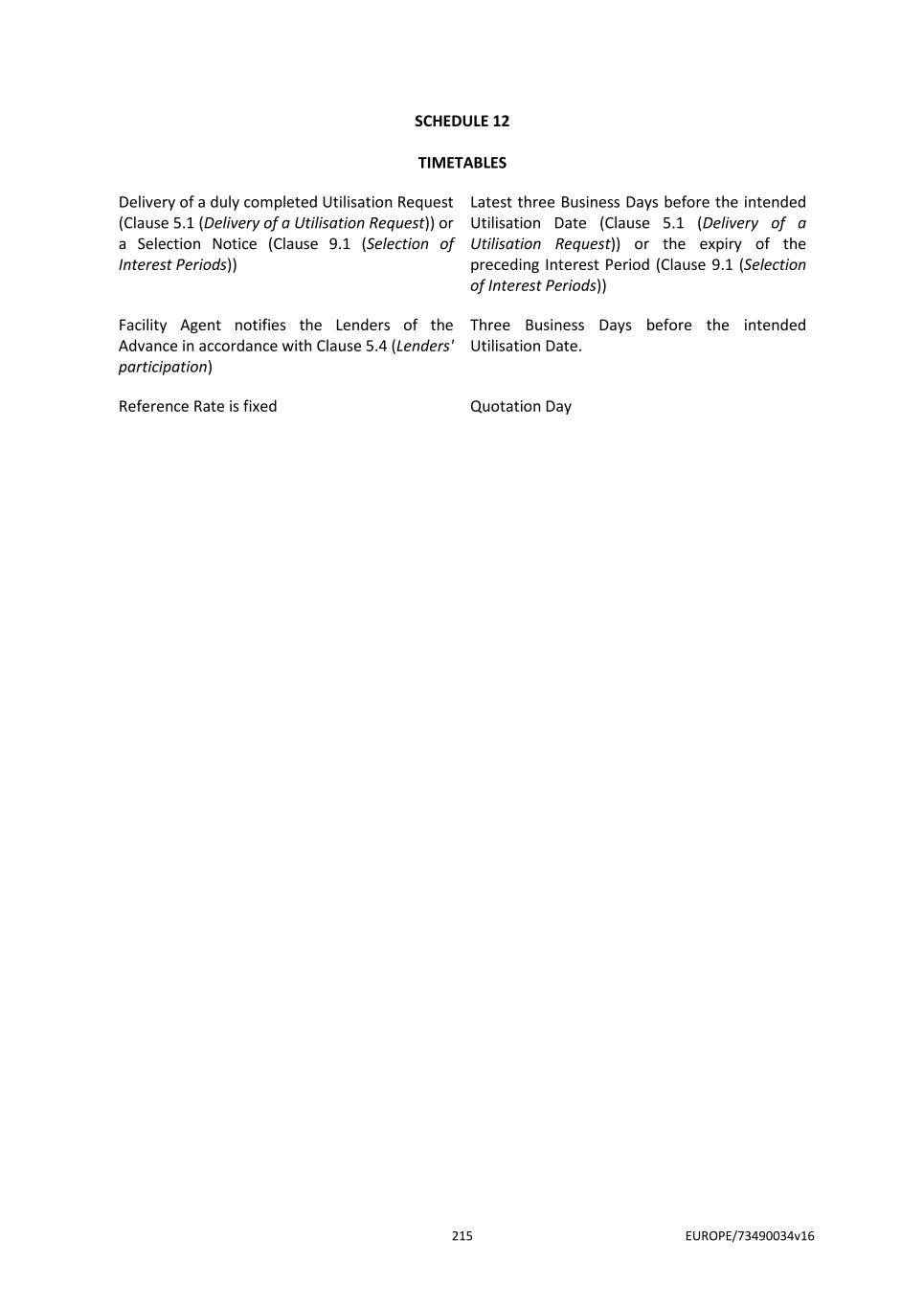 215 EUROPE/73490034v16 SCHEDULE 12 TIMETABLES Delivery of a duly completed Utilisation Request (Clause 5.1 (Delivery of a Utilisation Request)) or a Selection Notice (Clause 9.1 (Selection of Interest Periods)) Latest three Business Days before the intended Utilisation Date (Clause 5.1 (Delivery of a Utilisation Request)) or the expiry of the preceding Interest Period (Clause 9.1 (Selection of Interest Periods)) Facility Agent notifies the Lenders of the Advance in accordance with Clause 5.4 (Lenders' participation) Three Business Days before the intended Utilisation Date. Reference Rate is fixed Quotation Day