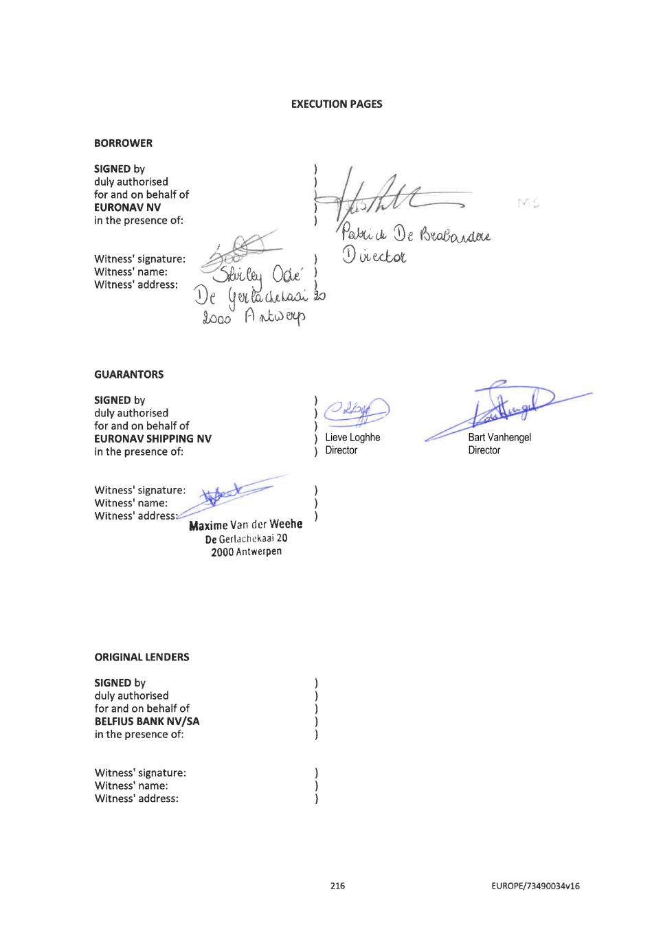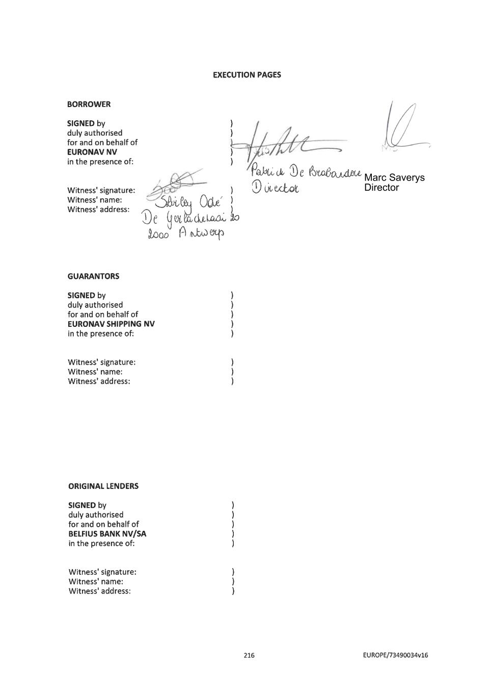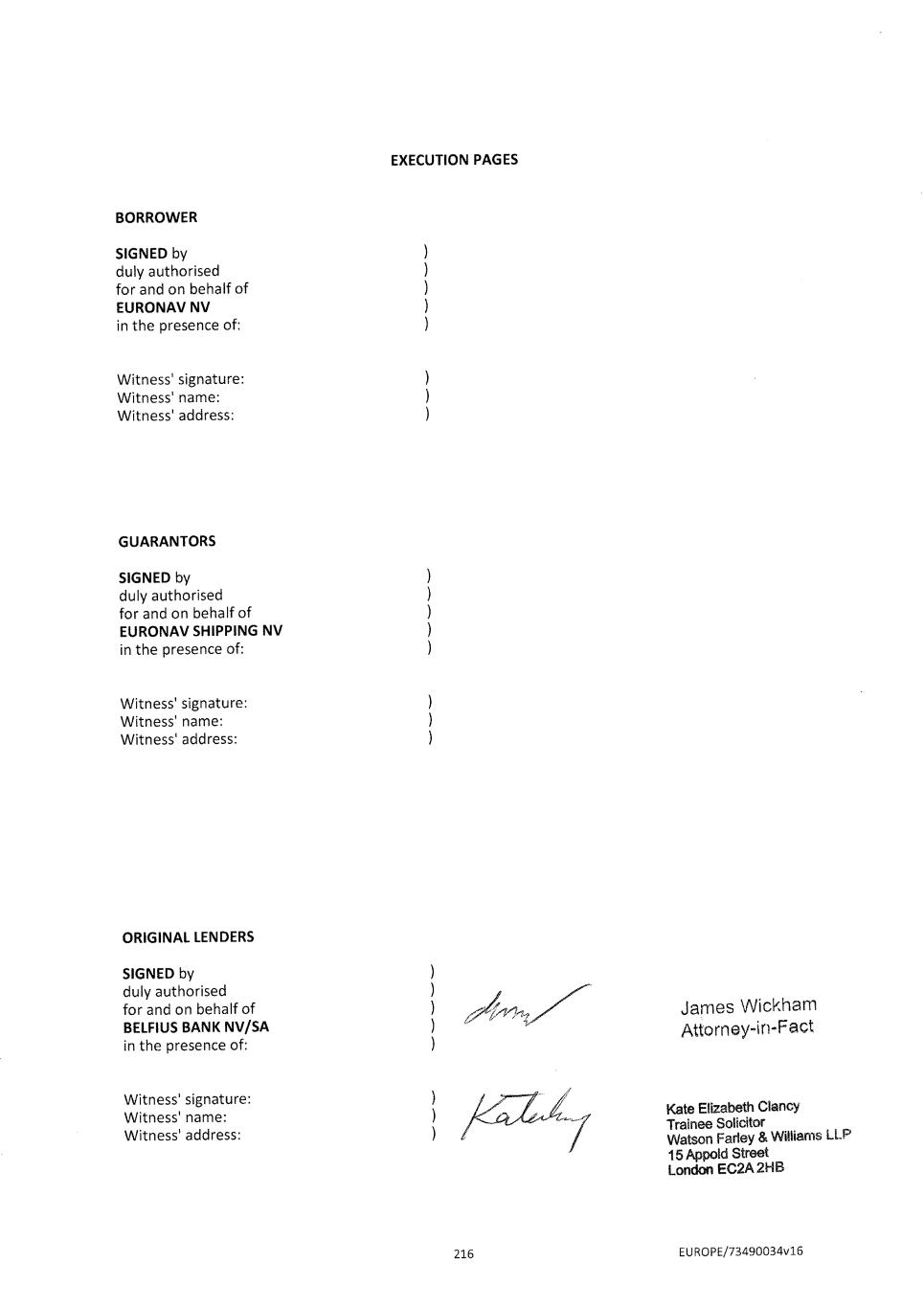 EXECUTION PAGES BORROWER SIGNED by duly authorised for and on behalf of EURONAV NV in the presence of: Witness' signature: Witness' name: Witness' address: GUARANTORS SIGNED by duly authorised for and on behalf of EURONAV SHIPPING NV in the presence of: Witness' signature: Witness' name: Witness' address: ORIGINAL LENDERS SIGNED by ) duly authorised for and on behalf of ) , ~~~~ BELFIUS BANK NV/SA ) in the presence of: ) Witness' signature: ) Witness' name: ) Witness' address: ) James Wickham ~t~C~Yi1~Y~°ICI~~~~~ Kate El'~zabeth CB~ncy Trainee ~oi'scit~r Watscan Far4ey ~ ~iliiam~ Ll.R~ 15 AppaEd Stresfi Londa's EC2A21~~ 216 EUROPE/73490034v16