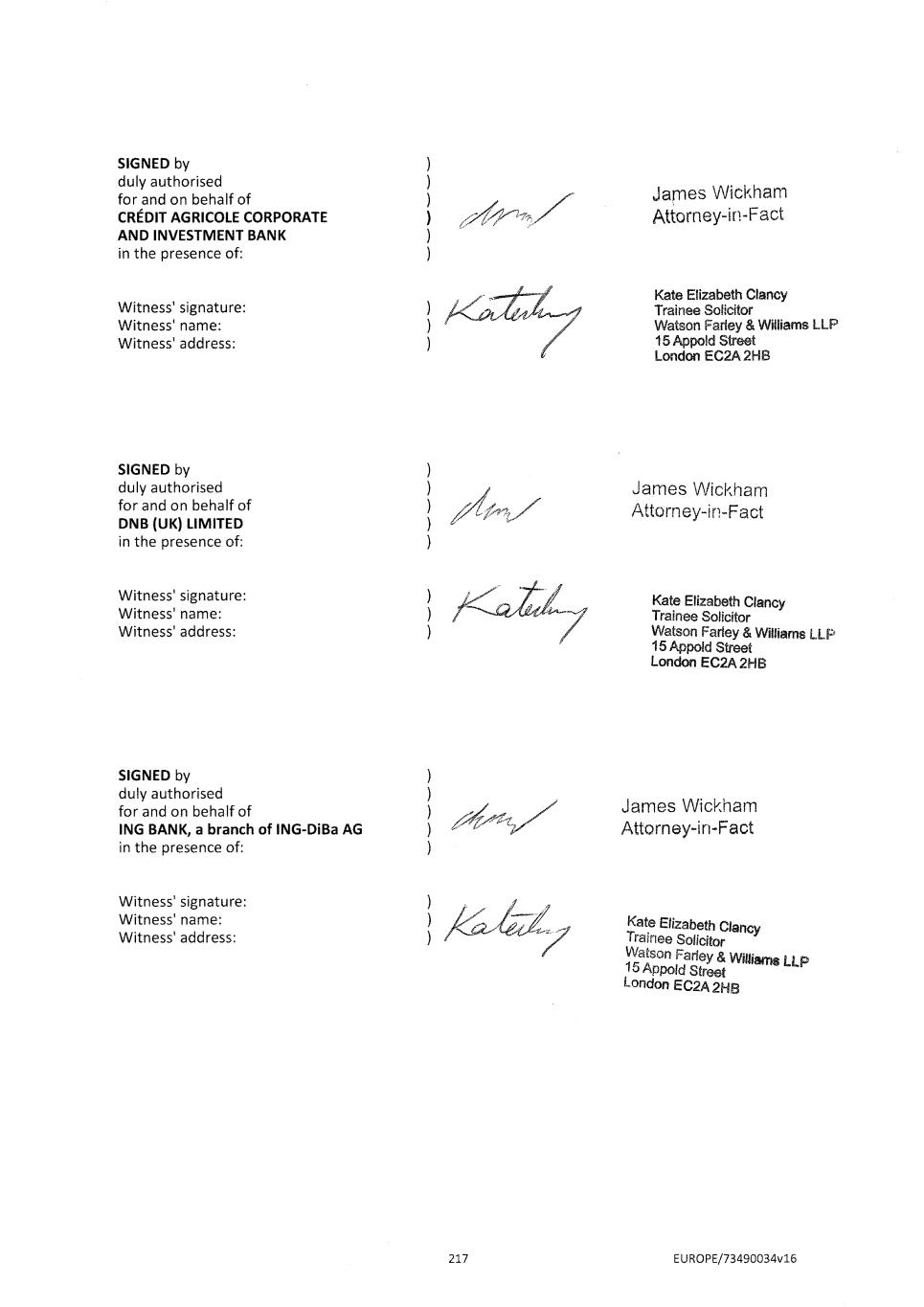 SIGNED by j duly authorised ) for and on behalf of ) ,~~CYteS W1CI~h~f~'1 CREDIT AGRICOLE CORPORATE ) ~,~~~~~ ,~~tflCCtE~-IC?-l=dC~ AND INVESTMENT BANK ) in the presence of: ) Witness' si nature: ~ Kate ~6izab~th Clang g ) 1'r~irre~ SolE~i~crr Witness' name: ) VV~t~an ~~r{~yE~VViEliams LLB' Witness' address: ) ~~~PK~~~ ~~" ~ Lorodon ~C2~,2ti~ SIGNED by duly authorised ) James Wccl:ham for and on behalf of ) G' , .~~'~~~ /~;~~rngy-I~?-F~Gt DNB (UK) LIMITED ) in the presence of: ) Witness' signature: ) Kati Etlzabeth Cl~nc~ Witness' name: ) r` Traie~e~ Solicitor Witness' address: ) ~l~t~or~ ~ar#~y & ~f9i~m~ L~.F° 9 5 ~ppc>!d Street Loner EC2A ~~0~ SIGNED by ) duly authorised for and on behalf of ~ James Wickham ING BANK, a branch of ING-DiBa AG ) ~~ At~~l'I~8y41n~~~C~ in the presence of: ) Witness' signature: ) Witness' name: ) 6Cate E6izabeth Gp~~cy Witness' address: ) `~ ~r~sn~~ ~~~~~rgQr VVa~~~n r~~(~y ~ ~/i6Jearr~s L9.p 1 ~ ~aP&~Ed ~tra~t London EC2R 2~d~ 217 EUROPE/73490034v16