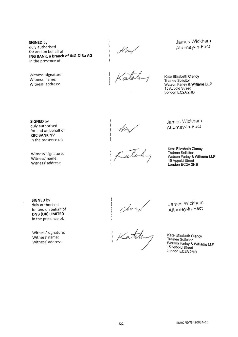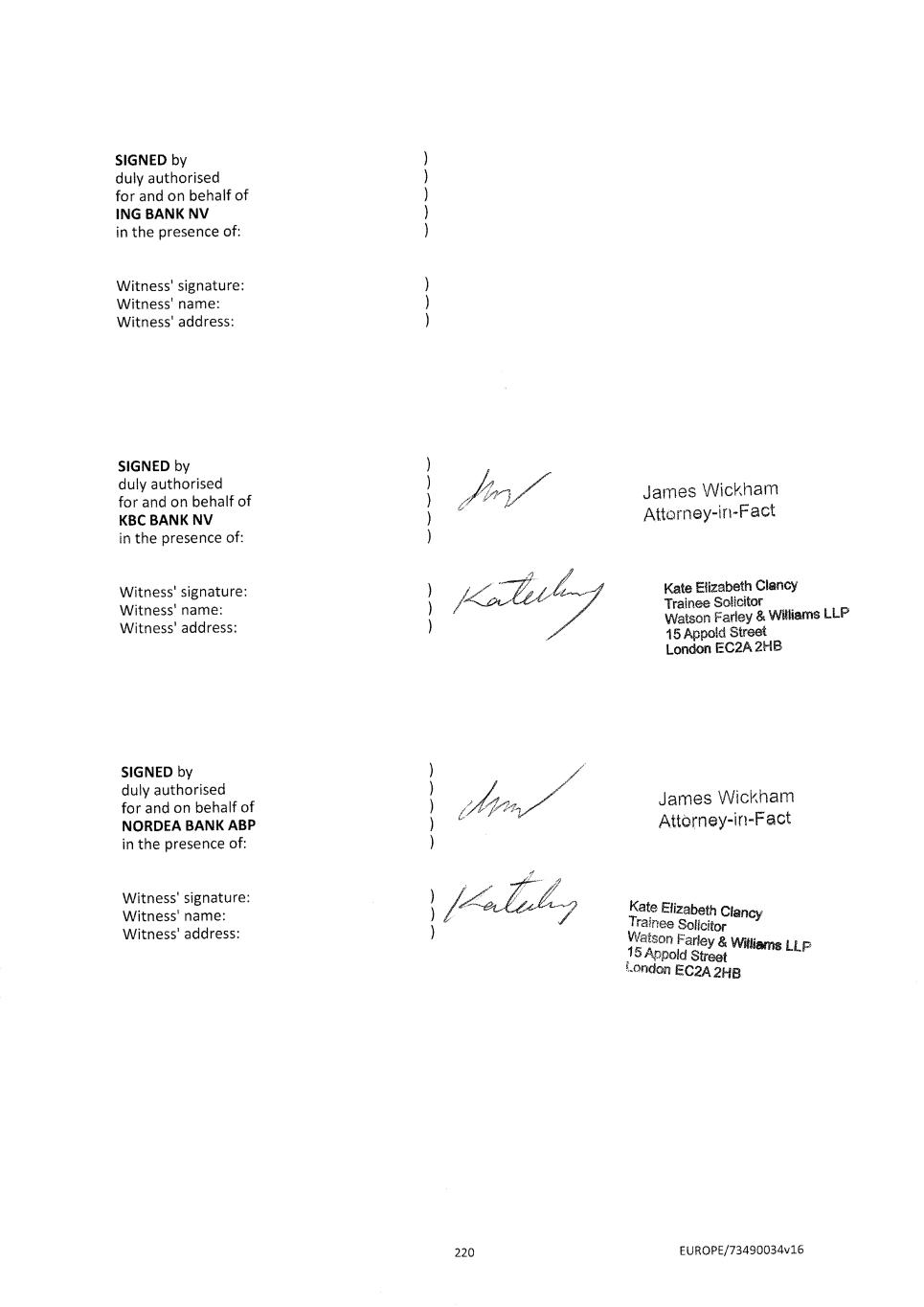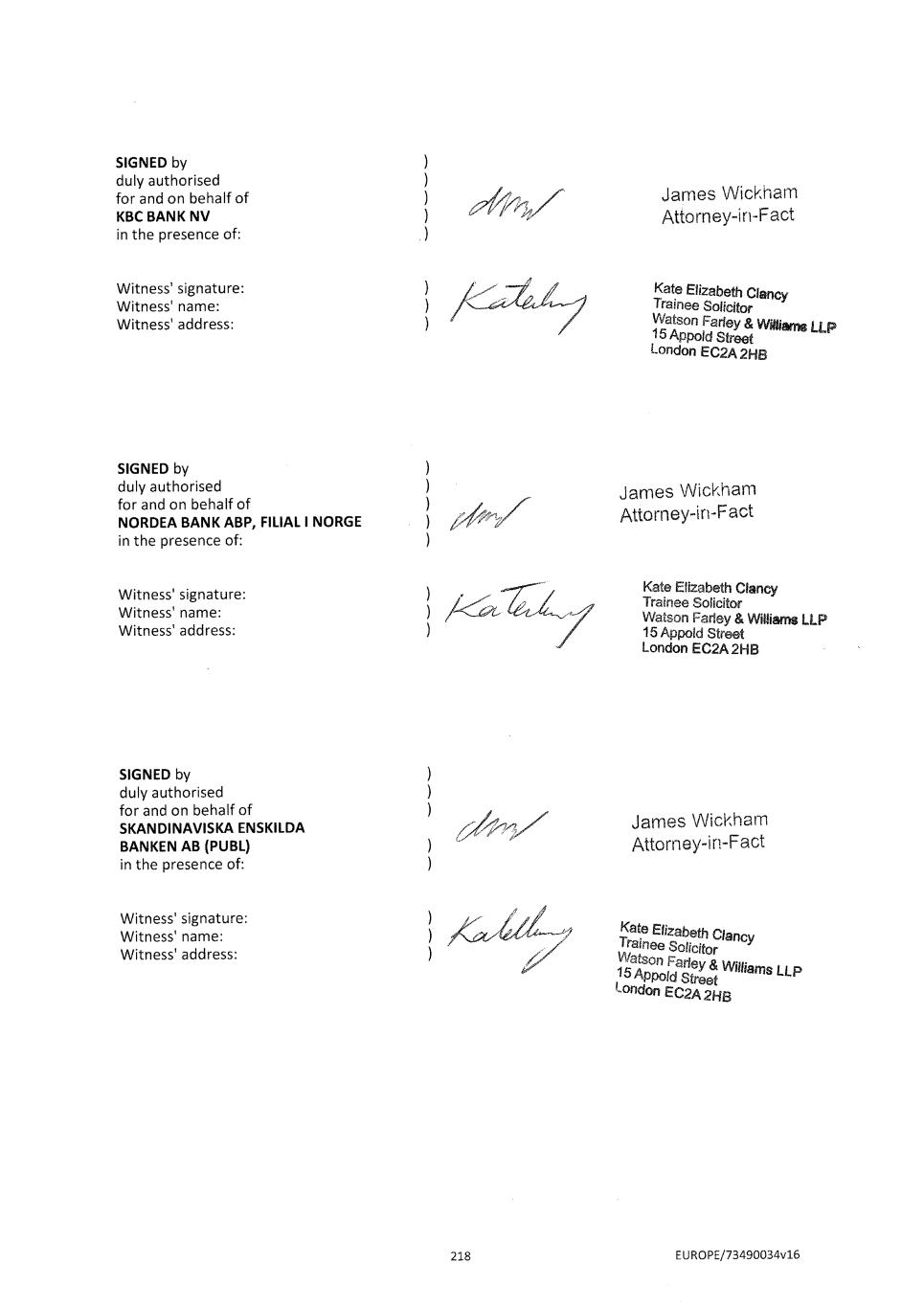 SIGNED by duly authorised for and on behalf of ING BANK NV in the presence of: Witness' signature: Witness' name: Witness' address: SIGNED by ) duly authorised ) ~ for and on behalf of ) ~ ~'~~` James Wickham KBC BANK NV ) A~ti~f'11~y-If't-F~C~ in the presence of: ) Witness' signature: ) ~, , K.~t~ ~li b~~h G9~r~c~ i'r~@nom Scs9=~9tor Witness' name: ) ~~~~~~ ~~~6~~~~~~°~~~ ~'~'~ Witness' address: ) 15 p~~c~ ~tra~g London EC2l~ 2~6~ SIGNED by ) duly authorised ) for and on behalf of ) CF,r,% '" ~lat~leS ~ViCkha~'t NORDEA BANK ABP ) ~~$C3.rt~~~/-ICI-F~Gt in the presence of: ) Witness' signature: ) P Witness' name: ) "`~ ~~t~ ~ii,~~~g~ Cl~nc ~s`~€r~e~ ~~9scitor ~ Witness' address: ) ~'e~~~~~ ~~rl~y ~ y~~,r~ LE.~ 1 ~ a~„g ~aEd Stmt ~:.r~~ds~~s ~~2A 2Fi~ 220 EUROPE/73490034v16