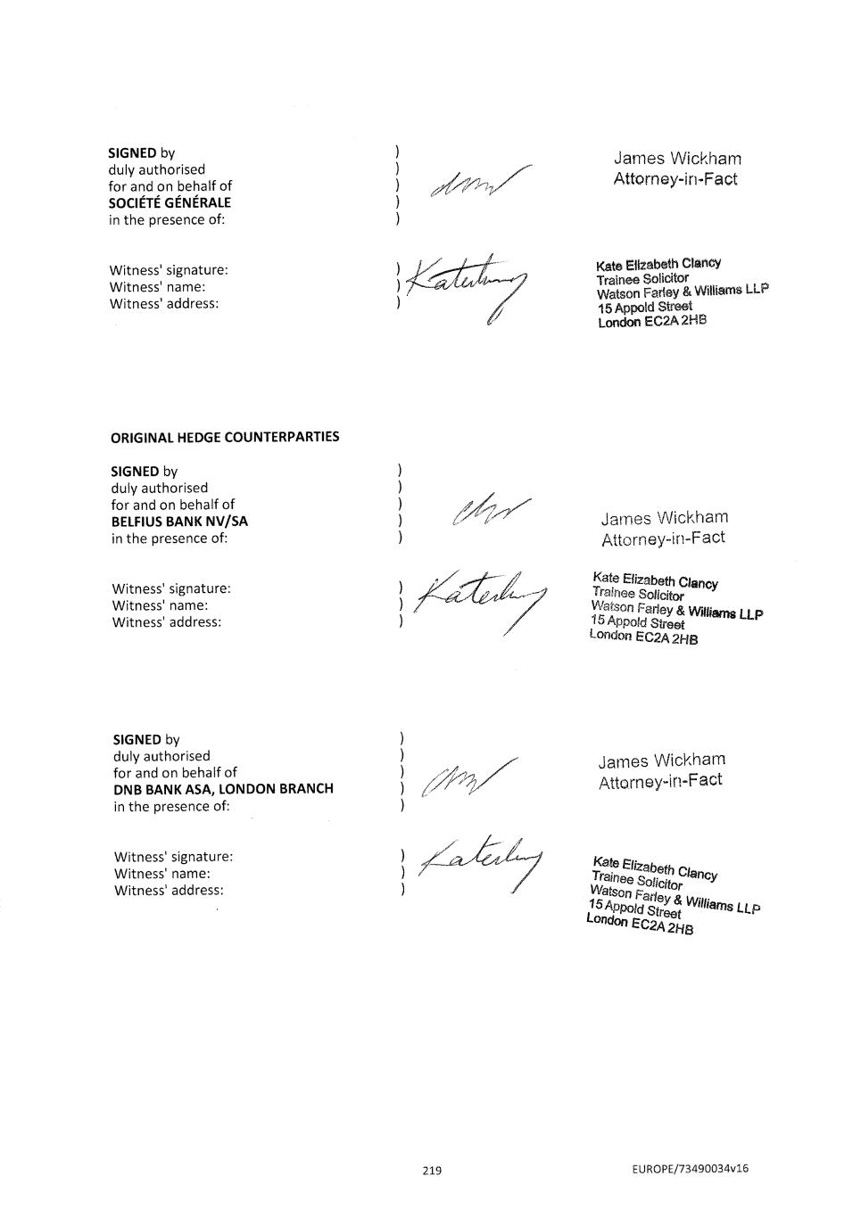 SIGNED by 1 James Wickham duly authorised ) for and on behalf of ) ,~"Y"~'%~~ ~~~~'~~~~'~r~"~~~~ ~ .; SOCIETE GENERALE ) in the presence of: ) Witness' signature: ) ~ _`~`~`°~` ~ ~~4~~~~~~ ~i~~ ~'rafn~e ~~~`~~r Witness' name: ) ~ a~~~~ ~~~~Y ~ ~ i~l~~~$ ~~~ Witness' address: ) 15 ~p(sold ~tr ~ London ~C2,~ ~E~ ORIGINAL HEDGE COUNTERPARTIES SIGNED by duly authorised ) for and on behalf of ) ,;a~ BELFIUS BANK NV/SA ) ~~'` L Ja~rres Wicl.ham in the presence of: ) Att~r~ey-irt-Fact Kati Efd~,ab~tt~ Cl~r~cy Witness' signature: ) ~r~~~~~, ~~f~~ip~, Witness' name: ~ ~'~~`'~~ ~"~~~1 ~ VV~Idt'~'p~i LLF~ Witness' address: ) ~~~~~~~d~~re~~ ~o~ie3caea ~~2A2d-8~ SIGNED by ) duly authorised ) Names Wicl:h~m for and on behalf of ) , ~ ~- DNB BANK ASA, LONDON BRANCH ) ~ "~°~~'' Atta.rn~y~~r?-F~ct in the presence of: ) Witness' signature: ) - ~ ~ ~~~ Witness' name: ) ~.~~ ~~~f~~~rr~~b~~h Gl~r~cy ~ca66crtor Witness' address: ~ ~~~°n ~"P~~~~ ~P'Il~rpp~ L~~ 15 ~,p~fd 5fre~g Larrdory EC2~ 2~~ Z1g EUROPE/73490034v16