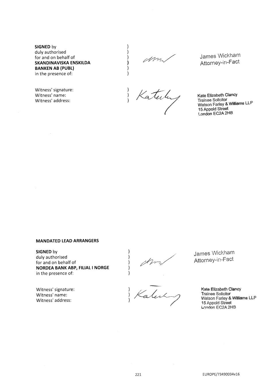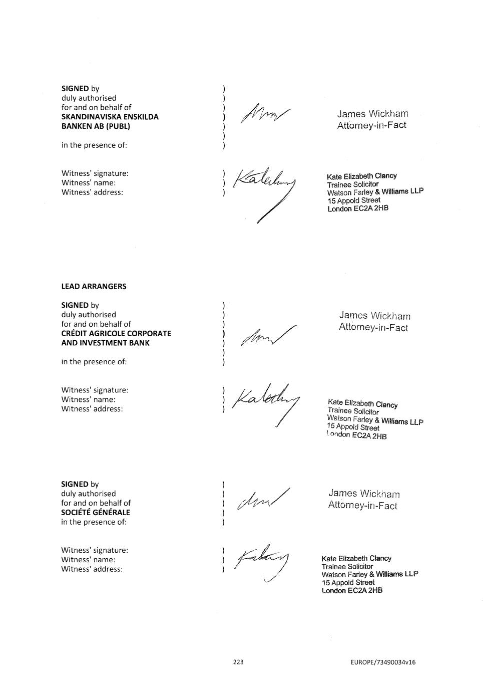 SIGNED by ) duly authorised ) for and on behalf of SKANDINAVISKA ENSKILDA ) ~ James Wicl;f~am BANKEN AB (PUBL) ) ~tt~rney-ire-Fact in the presence of: Witness' signature: ) Witness' name: ~~y ~ i~~te ~a~xab~th Clancy ~ Tr~Er~~e ~alicitssr Witness' address: ) V~a~~~~ ~ «s₹~~' ~ ~e~e~~~~ ~-L~ ~' 15 A~~ai~ ~₹r~e~ Londe~r~ ~C2~ 2E~~ LEAD ARRANGERS SIGNED by duly authorised ) James Wickham for and on behalf of ) /~ttorney~irr-Fact CREDIT AGRICOIE CORPORATE J ~;~ AND INVESTMENT BANK ) G' ` "~~~ in the presence of: ) Witness' signature: ) Witness' name: ) ~~t~ ~r~z~b~t~ Ce~nc~a Witness' address: ) ~'~~E~~~ ~~~~~~~~` V~~~~~c~r~ F'~r@~y ~ VV69P~~m~ LLF% 15 ~ap~~yl ~t€` ~ !. on~ar~ ~C264 2F8~ SIGNED by ) duly authorised ) ~ J~riles WiCkna~ n for and on behalf of ) ~ ~~~~°~ Attr~rney~in-Faci SOCIETE GENERALE 1 in the presence of: Witness' signature: ) ,,,- Witness' name: ) Kate Elizabeth Cl~nc~ Witness' address: ) ~'rain~~ ~alacitc~r ~ ~fa~~c~n ~~~E~y ~ !~/~6l~rt~s LLB 15 ~ppolc4 ~tc~~ Condon ~C2A 2hi~ 223 EUROPE/73490034v16