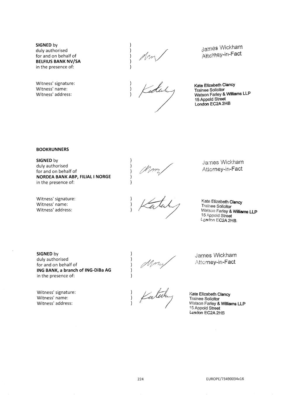 SIGNED by duly authorised for and on behalf of KBC BANK NV in the presence of: Witness' signature: Witness' name: Witness' address: SIGNED by duly authorised for and on behalf of NORDEA BANK ABP, FILIAL I NORGE in the presence of: Witness' signature: Witness' name: Witness' address: SIGNED by duly authorised for and on behalf of SKANDINAVISKA ENSKILDA BANKEN AB (PUBL) in the presence of: Witness' signature: Witness' name: Witness' address: ~f~`l~~ , James Wickham ~ttarney-ire-fact 6Cate Eilzabeth Cl~r~~y Tragne~ ~aE~~itor V'Uatsor~ ~'~rfi~;~ ~ ~f any LLB 15 ,4ppmEd ~Br~et (_ondan ECG 2~~ James Wicl:r~am Attorney-in-fact Ka~~ ~6i~~ks~~h Clancy ~fatCRE~ ~O~iCt~CbP V~l~~~c~~a ~~e~~y ~ ~/iqi LLB 15 AppoEci Stet London EG2e42~f~ James Wrcl;ham Attor~~ey~ir~-Fact tCate ~1i~ab~~h Clancy Trainee ~Q€~ergc~r ~'~~~~~~ ~~~~Y ~ Wi9t6~rns LLP ~10 d€s~~~~2~4 2ti~ 218 EUROPE/73490034v16
