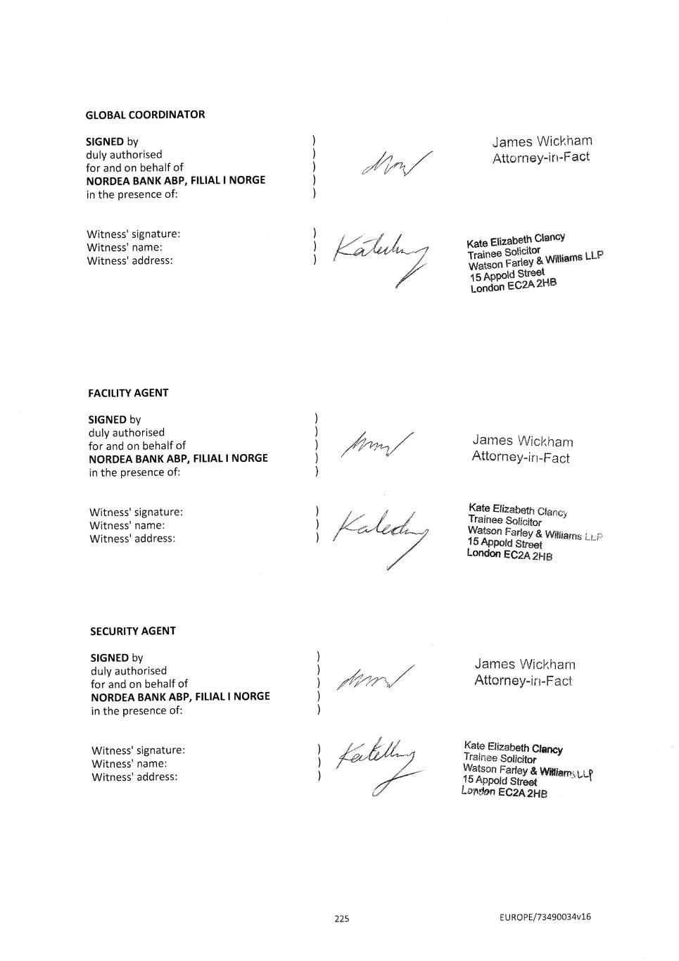GLOBAL COORDINATOR SIGNED by duly authorised for and on behalf of NORDEA BANK ABP, FILIAL I NORGE in the presence of: Witness' signature: Witness' name: Witness' address: FACILITY AGENT SIGNED by duly authorised for and on behalf of NORDEA BANK ABP, FILIAL I NORGE in the presence of: Witness' signature: Witness' name: Witness' address: SECURITY AGENT SIGNED by duly authorised for and on behalf of NORDEA BANK ABP, FILIAL I NORGE in the presence of: Witness' signature: Witness' name: Witness' address: ``' f "~~~ ,~ ~,y.~ ~ ,~. ~r ,~ ~ ~ James Wickham ~,ttorn~y-ire-F~ck Kate Elixab~$h ~,~nc~ Tramn~e ~o~i~ci~or~ ~Vilt~ams L~.~° V~a~~an tl S~`~~# 4 5 PapP~ London ~C2~ 2~~ James Wickham Att~rn~y-ire-Fact Kate ~li.~ab~t~ ~E~r,~ 1'rasn€~~ ~~ltci~ar Wa~sc~►~ ~'~~ey ~ VVE@Pi~errs ~~h_~Y 15 ~sPreld St~~~ ~ond~ ~Czq 2~t James Wickham ~tt~rn~y-irr-Fact Ka4e ~lez~beth Ct~r~cy Tra€~;4~ aalieitar IOVafisc~n ~ari~y ~ V~ogi ~~,~ ~ ~ ~~pold qtr ~~~~s~ ~C2A 2Fi 225 EUROPE/73490034v16