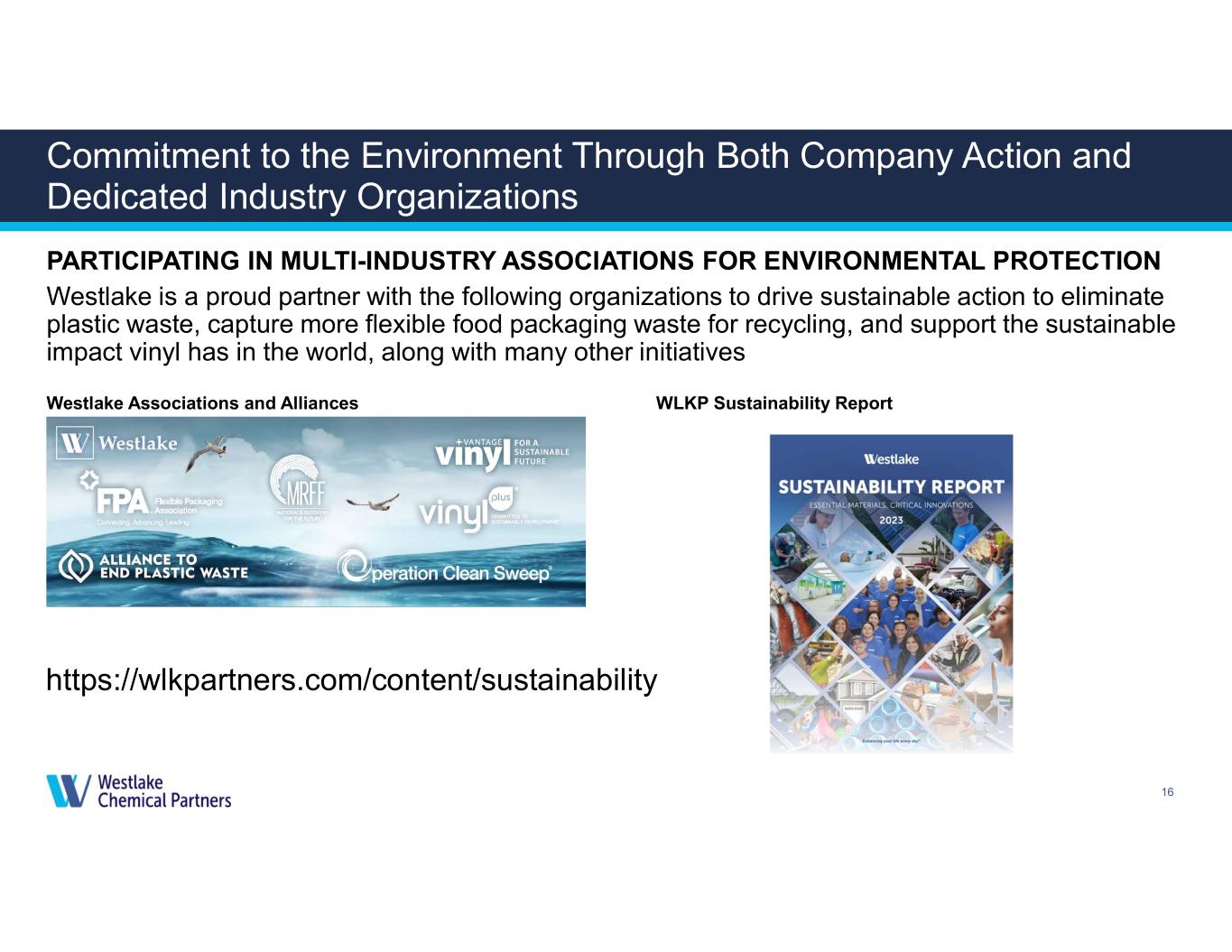 16 Commitment to the Environment Through Both Company Action and Dedicated Industry Organizations PARTICIPATING IN MULTI-INDUSTRY ASSOCIATIONS FOR ENVIRONMENTAL PROTECTION Westlake is a proud partner with the following organizations to drive sustainable action to eliminate plastic waste, capture more flexible food packaging waste for recycling, and support the sustainable impact vinyl has in the world, along with many other initiatives Westlake Associations and Alliances WLKP Sustainability Report https://wlkpartners.com/content/sustainability