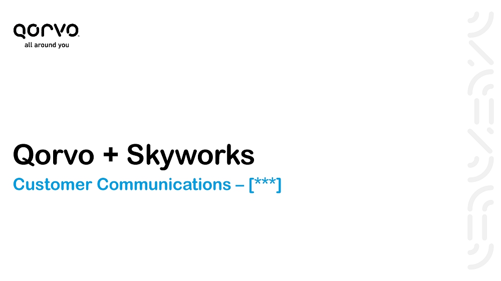 This document contains “forward-looking statements” within the meaning of the federal securities laws, including Section 27A of the U.S. Securities Act of 1933, as amended, and Section 21E of the Securities Exchange Act of 1934, as amended. These forward-looking statements are based on Skyworks’s and Qorvo’s current expectations, estimates and projections about the expected date of closing of the proposed transaction and the potential benefits thereof, their respective businesses and industries, management’s beliefs and certain assumptions made by Skyworks and Qorvo, all of which are subject to change. In this context, forward-looking statements often address expected future business and financial performance and financial condition, and often contain words such as “expect,” “anticipate,” “intend,” “plan,” “believe,” “could,” “seek,” “see,” “will,” “may,” “would,” “might,” “potentially,” “estimate,” “continue,” “expect,” “target,” similar expressions or the negatives of these words or other comparable terminology that convey uncertainty of future events or outcomes. All forward-looking statements by their nature address matters that involve risks and uncertainties, many of which are beyond our control and are not guarantees of future results, such as statements about the consummation of the proposed transaction and the anticipated benefits thereof. These and other forward-looking statements, including the failure to consummate the proposed transaction or to make or take any filing or other action required to consummate the transaction on a timely matter or at all, are not guarantees of future results and are subject to risks, uncertainties and assumptions that could cause actual results to differ materially from those expressed in any forward-looking statements. Accordingly, there are or will be important factors that could cause actual results to differ materially from those indicated in such statements and, therefore, you should not place undue reliance on any such statements and caution must be exercised in relying on forward-looking statements. Important risk factors that may cause such a difference include, but are not limited to: (i) the completion of the proposed transaction on anticipated terms and timing, including obtaining shareholder and regulatory approvals, anticipated tax treatment, unforeseen liabilities, future capital expenditures, revenues, expenses, earnings, synergies, economic performance, indebtedness, financial condition, losses, future prospects, business and management strategies, expansion and growth of Qorvo’s and Skyworks’s businesses and other conditions to the completion of the proposed transaction; (ii) failure to realize the anticipated benefits of the proposed transaction, including as a result of delay in completing the transaction or integrating the businesses of Skyworks and Qorvo; (iii) Skyworks’s and Qorvo’s ability to implement their business strategies; (iv) pricing trends; (v) potential litigation relating to the proposed transaction that could be instituted against Skyworks, Qorvo or their respective directors; (vi) the risk that disruptions from the proposed transaction will harm Skyworks’s or Qorvo’s business, including current plans and operations; (vii) the ability of Skyworks or Qorvo to retain and hire key personnel; (viii) potential adverse reactions or changes to business relationships resulting from the announcement, pendency or completion of the proposed transaction; (ix) uncertainty as to the long-term value of Skyworks’s common stock; (x) legislative, regulatory and economic developments affecting Skyworks’s and Qorvo’s businesses; (xi) general economic and market developments and conditions; (xii) the evolving legal, regulatory and tax regimes under which Skyworks and Qorvo operate; (xiii) potential business uncertainty, including changes to existing business relationships, during the pendency of the proposed transaction that could affect Skyworks’s or Qorvo’s financial performance; (xiv) restrictions during the pendency of the proposed transaction that may impact Skyworks’s or Qorvo’s ability to pursue certain business opportunities or strategic transactions; (xv) unpredictability and severity of catastrophic events, including, but not limited to, acts of terrorism or outbreak of war or hostilities, as well as Skyworks’s and Qorvo’s response to any of the aforementioned factors; and (xvi) failure to receive the approval of the stockholders of Skyworks and Qorvo. These risks, as well as other risks associated with the proposed transaction, are more fully discussed in the proxy statement/prospectus to be filed with the U.S. Securities and Exchange Commission in connection with the proposed transaction. While the list of factors presented here is, and the list of factors presented in the proxy statement/prospectus will be, considered representative, no such list should be considered to be a complete statement of all potential risks and uncertainties. Unlisted factors may present significant additional obstacles to the realization of forward looking statements. Consequences of material differences in results as compared with those anticipated in the forward-looking statements could include, among other things, business disruption, operational problems, financial loss, legal liability to third parties and similar risks, any of which could have a material adverse effect on Skyworks’s or Qorvo’s consolidated financial condition, results of operations or liquidity. Neither Skyworks nor Qorvo assumes any obligation to publicly provide revisions or updates to any forward-looking statements, whether as a result of new information, future developments or otherwise, should circumstances change, except as otherwise required by securities and other applicable laws.