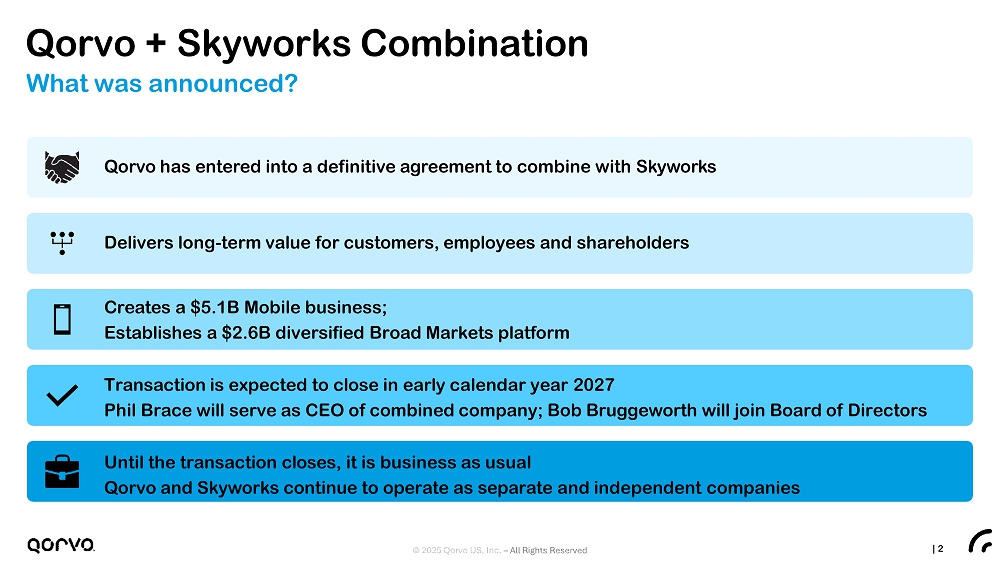 Qorvo + Skyworks Combination What was announced? Qorvo has entered into a definitive agreement to combine with Skyworks Delivers long - term value for customers, employees and shareholders Creates a $5.1B Mobile business; Establishes a $2.6B diversified Broad Markets platform Transaction is expected to close in early calendar year 2027 Phil Brace will serve as CEO of combined company; Bob Bruggeworth will join Board of Directors Until the transaction closes, it is business as usual Qorvo and Skyworks continue to operate as separate and independent companies 2