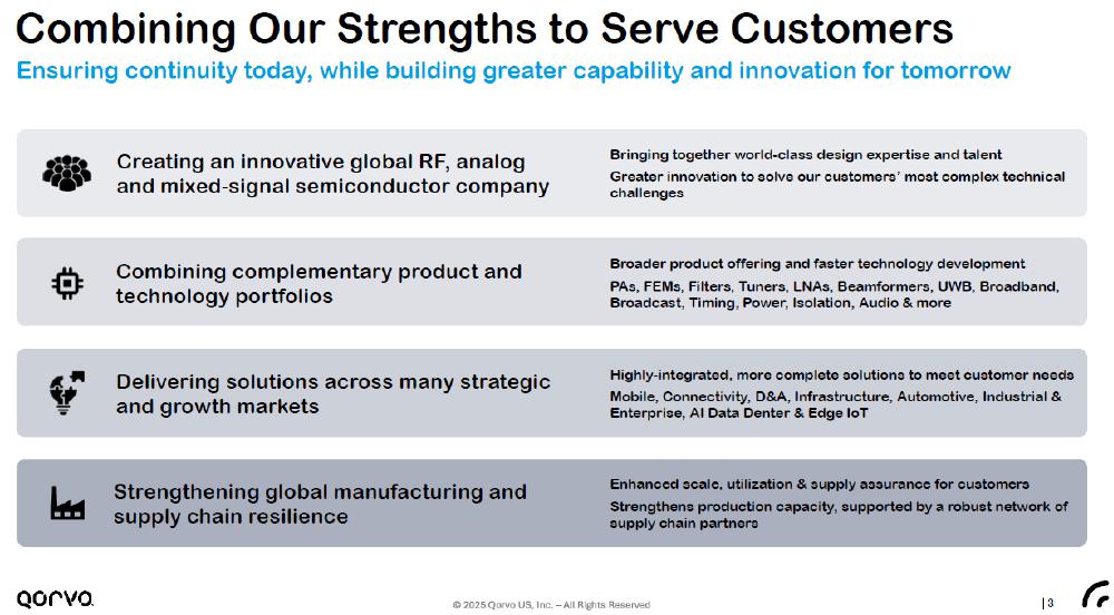 Combining Our Strengths to Serve Customers Ensuring continuity today, while building greater capability and innovation for tomorrow Bringing together world - class design expertise and talent Greater innovation to solve our customers’ most com challenges Broader product off PAs, FEMs, Broad Creating an innovative global RF, analog and mixed - signal semiconductor company Combining complementary product and technology portfolios Delivering solutions across man and growth markets Stren 3