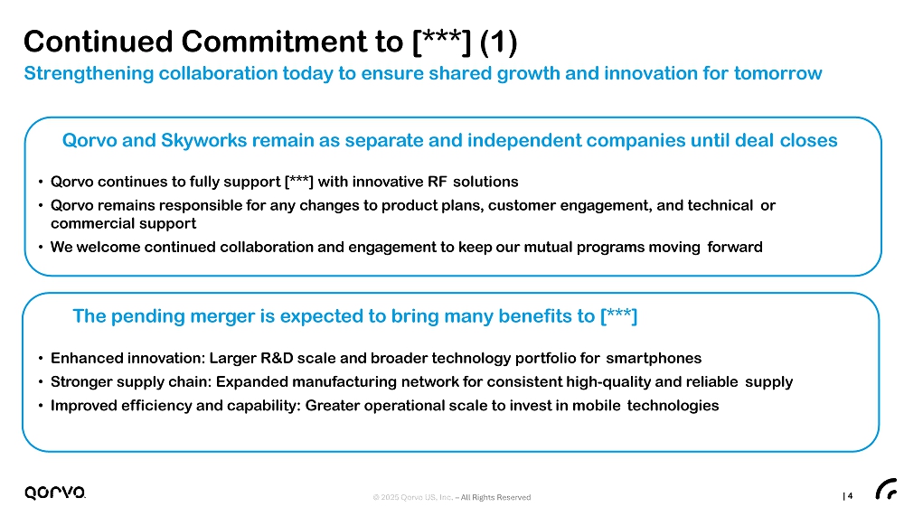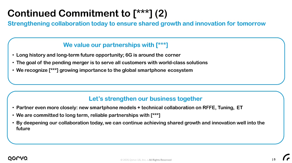 Continued Commitment to [***] (1) Strengthening collaboration today to ensure shared growth and innovation for tomorrow 4 Qorvo and Skyworks remain as separate and independent companies until deal closes • Qorvo continues to fully support [***] with innovative RF solutions • Qorvo remains responsible for any changes to product plans, customer engagement, and technical or commercial support • We welcome continued collaboration and engagement to keep our mutual programs moving forward The pending merger is expected to bring many benefits to [***] • Enhanced innovation: Larger R&D scale and broader technology portfolio for smartphones • Stronger supply chain: Expanded manufacturing network for consistent high - quality and reliable supply • Improved efficiency and capability: Greater operational scale to invest in mobile technologies