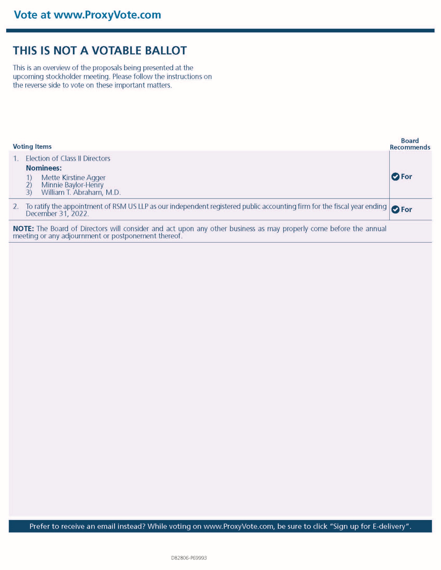 Vote at www.ProxyVote.com THIS IS NOT A VOTABLE BALLOT This is an overview of the proposals being presented at the upcoming stockholder meeting. Please follow the instructions on the reverse side to vote on these important matters. Board Recommends Voting Items 1. Election of Class II Directors Nominees: For 1) Mette Kirstine Agger 2) Minnie Baylor-Henry 3) William T. Abraham, M.D. 2. To ratify the appointment of RSM US LLP as our independent registered public accounting firm for the fiscal year ending December 31, 2022. For NOTE: The Board of Directors will consider and act upon any other business as may properly come before the annual meeting or any adjournment or postponement thereof. Prefer to receive an email instead? While voting on www.ProxyVote.com, be sure to click “Sign up for E-delivery”. D82806-P69993
