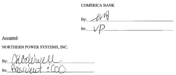 This Letter Agreement shall constitute the agreement between Comerica Bank (“Lender”) and Northern Power Systems, Inc. (“Borrower”) with respect to the Export Revolving Loan described above in the maximum amount of $2,500,000 (the “Maximum Amount”), and shall become effective upon the execution and delivery to Lender (in form satisfactory to Lender) of this Letter Agreement and each of the other documents, listed on the Closing Checklist attached hereto as Exhibit “A” (such documents, together with each other document, instrument and agreement previously, contemporaneously; or subsequently delivered pursuant hereto called the “Documents”), and the satisfaction of all other requirements set forth on the Closing Checklist.