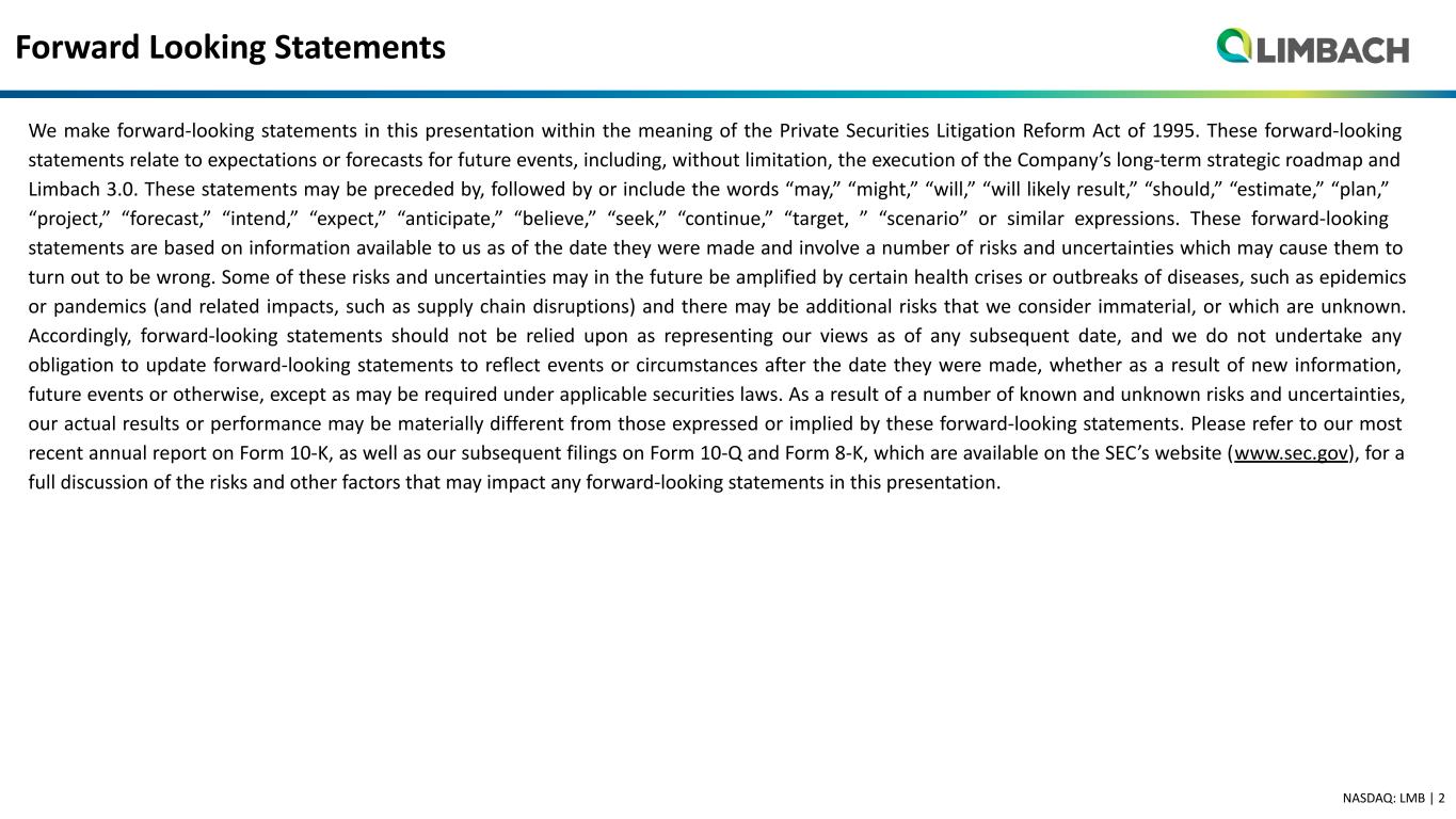 NASDAQ: LMB | 2 We make forward-looking statements in this presentation within the meaning of the Private Securities Litigation Reform Act of 1995. These forward-looking statements relate to expectations or forecasts for future events, including, without limitation, the execution of the Company’s long-term strategic roadmap and Limbach 3.0. These statements may be preceded by, followed by or include the words “may,” “might,” “will,” “will likely result,” “should,” “estimate,” “plan,” “project,” “forecast,” “intend,” “expect,” “anticipate,” “believe,” “seek,” “continue,” “target, ” “scenario” or similar expressions. These forward-looking statements are based on information available to us as of the date they were made and involve a number of risks and uncertainties which may cause them to turn out to be wrong. Some of these risks and uncertainties may in the future be amplified by certain health crises or outbreaks of diseases, such as epidemics or pandemics (and related impacts, such as supply chain disruptions) and there may be additional risks that we consider immaterial, or which are unknown. Accordingly, forward-looking statements should not be relied upon as representing our views as of any subsequent date, and we do not undertake any obligation to update forward-looking statements to reflect events or circumstances after the date they were made, whether as a result of new information, future events or otherwise, except as may be required under applicable securities laws. As a result of a number of known and unknown risks and uncertainties, our actual results or performance may be materially different from those expressed or implied by these forward-looking statements. Please refer to our most recent annual report on Form 10-K, as well as our subsequent filings on Form 10-Q and Form 8-K, which are available on the SEC’s website (www.sec.gov), for a full discussion of the risks and other factors that may impact any forward-looking statements in this presentation. Forward Looking Statements