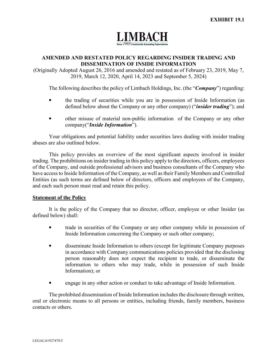 EXHIBIT 19.1 LEGAL\61927478\5 AMENDED AND RESTATED POLICY REGARDING INSIDER TRADING AND DISSEMINATION OF INSIDE INFORMATION (Originally Adopted August 26, 2016 and amended and restated as of February 23, 2019, May 7, 2019, March 12, 2020, April 14, 2023 and September 5, 2024) The following describes the policy of Limbach Holdings, Inc. (the “Company”) regarding: • the trading of securities while you are in possession of Inside Information (as defined below about the Company or any other company) (“insider trading”); and • other misuse of material non-public information of the Company or any other company(“Inside Information”). Your obligations and potential liability under securities laws dealing with insider trading abuses are also outlined below. This policy provides an overview of the most significant aspects involved in insider trading. The prohibitions on insider trading in this policy apply to the directors, officers, employees of the Company, and outside professional advisors and business consultants of the Company who have access to Inside Information of the Company, as well as their Family Members and Controlled Entities (as such terms are defined below of directors, officers and employees of the Company, and each such person must read and retain this policy. Statement of the Policy It is the policy of the Company that no director, officer, employee or other Insider (as defined below) shall: • trade in securities of the Company or any other company while in possession of Inside Information concerning the Company or such other company; • disseminate Inside Information to others (except for legitimate Company purposes in accordance with Company communications policies provided that the disclosing person reasonably does not expect the recipient to trade, or disseminate the information to others who may trade, while in possession of such Inside Information); or • engage in any other action or conduct to take advantage of Inside Information. The prohibited dissemination of Inside Information includes the disclosure through written, oral or electronic means to all persons or entities, including friends, family members, business contacts or others.