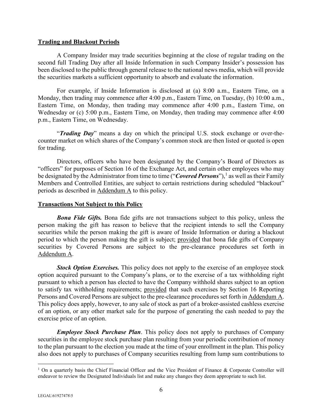 6 LEGAL\61927478\5 Trading and Blackout Periods A Company Insider may trade securities beginning at the close of regular trading on the second full Trading Day after all Inside Information in such Company Insider’s possession has been disclosed to the public through general release to the national news media, which will provide the securities markets a sufficient opportunity to absorb and evaluate the information. For example, if Inside Information is disclosed at (a) 8:00 a.m., Eastern Time, on a Monday, then trading may commence after 4:00 p.m., Eastern Time, on Tuesday, (b) 10:00 a.m., Eastern Time, on Monday, then trading may commence after 4:00 p.m., Eastern Time, on Wednesday or (c) 5:00 p.m., Eastern Time, on Monday, then trading may commence after 4:00 p.m., Eastern Time, on Wednesday. “Trading Day” means a day on which the principal U.S. stock exchange or over-the- counter market on which shares of the Company’s common stock are then listed or quoted is open for trading. Directors, officers who have been designated by the Company’s Board of Directors as “officers” for purposes of Section 16 of the Exchange Act, and certain other employees who may be designated by the Administrator from time to time (“Covered Persons”),1 as well as their Family Members and Controlled Entities, are subject to certain restrictions during scheduled “blackout” periods as described in Addendum A to this policy. Transactions Not Subject to this Policy Bona Fide Gifts. Bona fide gifts are not transactions subject to this policy, unless the person making the gift has reason to believe that the recipient intends to sell the Company securities while the person making the gift is aware of Inside Information or during a blackout period to which the person making the gift is subject; provided that bona fide gifts of Company securities by Covered Persons are subject to the pre-clearance procedures set forth in Addendum A. Stock Option Exercises. This policy does not apply to the exercise of an employee stock option acquired pursuant to the Company’s plans, or to the exercise of a tax withholding right pursuant to which a person has elected to have the Company withhold shares subject to an option to satisfy tax withholding requirements; provided that such exercises by Section 16 Reporting Persons and Covered Persons are subject to the pre-clearance procedures set forth in Addendum A. This policy does apply, however, to any sale of stock as part of a broker-assisted cashless exercise of an option, or any other market sale for the purpose of generating the cash needed to pay the exercise price of an option. Employee Stock Purchase Plan. This policy does not apply to purchases of Company securities in the employee stock purchase plan resulting from your periodic contribution of money to the plan pursuant to the election you made at the time of your enrollment in the plan. This policy also does not apply to purchases of Company securities resulting from lump sum contributions to 1 On a quarterly basis the Chief Financial Officer and the Vice President of Finance & Corporate Controller will endeavor to review the Designated Individuals list and make any changes they deem appropriate to such list.