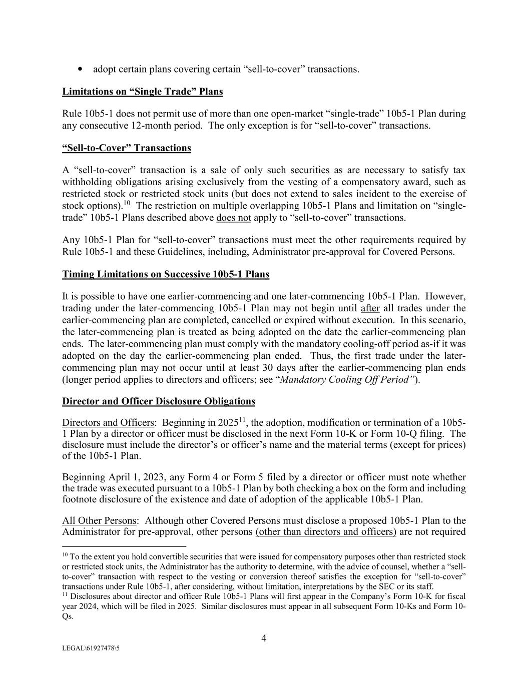 4 LEGAL\61927478\5 • adopt certain plans covering certain “sell-to-cover” transactions. Limitations on “Single Trade” Plans Rule 10b5-1 does not permit use of more than one open-market “single-trade” 10b5-1 Plan during any consecutive 12-month period. The only exception is for “sell-to-cover” transactions. “Sell-to-Cover” Transactions A “sell-to-cover” transaction is a sale of only such securities as are necessary to satisfy tax withholding obligations arising exclusively from the vesting of a compensatory award, such as restricted stock or restricted stock units (but does not extend to sales incident to the exercise of stock options).10 The restriction on multiple overlapping 10b5-1 Plans and limitation on “single- trade” 10b5-1 Plans described above does not apply to “sell-to-cover” transactions. Any 10b5-1 Plan for “sell-to-cover” transactions must meet the other requirements required by Rule 10b5-1 and these Guidelines, including, Administrator pre-approval for Covered Persons. Timing Limitations on Successive 10b5-1 Plans It is possible to have one earlier-commencing and one later-commencing 10b5-1 Plan. However, trading under the later-commencing 10b5-1 Plan may not begin until after all trades under the earlier-commencing plan are completed, cancelled or expired without execution. In this scenario, the later-commencing plan is treated as being adopted on the date the earlier-commencing plan ends. The later-commencing plan must comply with the mandatory cooling-off period as-if it was adopted on the day the earlier-commencing plan ended. Thus, the first trade under the later- commencing plan may not occur until at least 30 days after the earlier-commencing plan ends (longer period applies to directors and officers; see “Mandatory Cooling Off Period”). Director and Officer Disclosure Obligations Directors and Officers: Beginning in 202511, the adoption, modification or termination of a 10b5- 1 Plan by a director or officer must be disclosed in the next Form 10-K or Form 10-Q filing. The disclosure must include the director’s or officer’s name and the material terms (except for prices) of the 10b5-1 Plan. Beginning April 1, 2023, any Form 4 or Form 5 filed by a director or officer must note whether the trade was executed pursuant to a 10b5-1 Plan by both checking a box on the form and including footnote disclosure of the existence and date of adoption of the applicable 10b5-1 Plan. All Other Persons: Although other Covered Persons must disclose a proposed 10b5-1 Plan to the Administrator for pre-approval, other persons (other than directors and officers) are not required 10 To the extent you hold convertible securities that were issued for compensatory purposes other than restricted stock or restricted stock units, the Administrator has the authority to determine, with the advice of counsel, whether a “sell- to-cover” transaction with respect to the vesting or conversion thereof satisfies the exception for “sell-to-cover” transactions under Rule 10b5-1, after considering, without limitation, interpretations by the SEC or its staff. 11 Disclosures about director and officer Rule 10b5-1 Plans will first appear in the Company’s Form 10-K for fiscal year 2024, which will be filed in 2025. Similar disclosures must appear in all subsequent Form 10-Ks and Form 10- Qs.