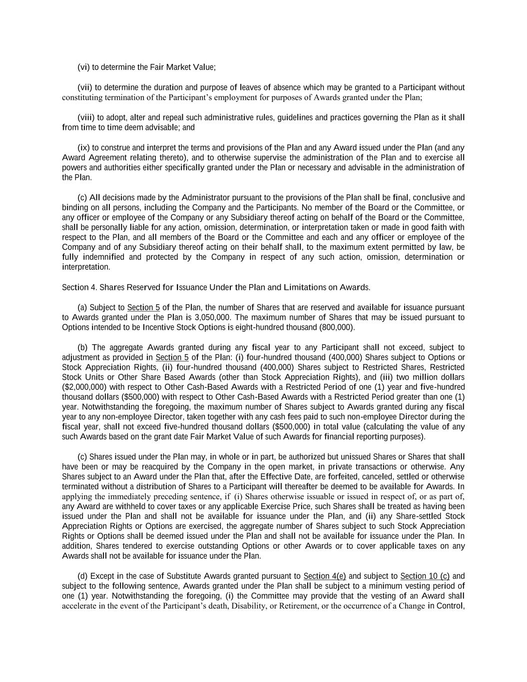 (vi) to determine the Fair Market Value; (vii) to determine the duration and purpose of leaves of absence which may be granted to a Participant without constituting termination of the Participant’s employment for purposes of Awards granted under the Plan; (viii) to adopt, alter and repeal such administrative rules, guidelines and practices governing the Plan as it shall from time to time deem advisable; and (ix) to construe and interpret the terms and provisions of the Plan and any Award issued under the Plan (and any Award Agreement relating thereto), and to otherwise supervise the administration of the Plan and to exercise all powers and authorities either specifically granted under the Plan or necessary and advisable in the administration of the Plan. (c) All decisions made by the Administrator pursuant to the provisions of the Plan shall be final, conclusive and binding on all persons, including the Company and the Participants. No member of the Board or the Committee, or any officer or employee of the Company or any Subsidiary thereof acting on behalf of the Board or the Committee, shall be personally liable for any action, omission, determination, or interpretation taken or made in good faith with respect to the Plan, and all members of the Board or the Committee and each and any officer or employee of the Company and of any Subsidiary thereof acting on their behalf shall, to the maximum extent permitted by law, be fully indemnified and protected by the Company in respect of any such action, omission, determination or interpretation. Section 4. Shares Reserved for Issuance Under the Plan and Limitations on Awards. (a) Subject to Section 5 of the Plan, the number of Shares that are reserved and available for issuance pursuant to Awards granted under the Plan is 3,050,000. The maximum number of Shares that may be issued pursuant to Options intended to be Incentive Stock Options is eight-hundred thousand (800,000). (b) The aggregate Awards granted during any fiscal year to any Participant shall not exceed, subject to adjustment as provided in Section 5 of the Plan: (i) four-hundred thousand (400,000) Shares subject to Options or Stock Appreciation Rights, (ii) four-hundred thousand (400,000) Shares subject to Restricted Shares, Restricted Stock Units or Other Share Based Awards (other than Stock Appreciation Rights), and (iii) two million dollars ($2,000,000) with respect to Other Cash-Based Awards with a Restricted Period of one (1) year and five-hundred thousand dollars ($500,000) with respect to Other Cash-Based Awards with a Restricted Period greater than one (1) year. Notwithstanding the foregoing, the maximum number of Shares subject to Awards granted during any fiscal year to any non-employee Director, taken together with any cash fees paid to such non-employee Director during the fiscal year, shall not exceed five-hundred thousand dollars ($500,000) in total value (calculating the value of any such Awards based on the grant date Fair Market Value of such Awards for financial reporting purposes). (c) Shares issued under the Plan may, in whole or in part, be authorized but unissued Shares or Shares that shall have been or may be reacquired by the Company in the open market, in private transactions or otherwise. Any Shares subject to an Award under the Plan that, after the Effective Date, are forfeited, canceled, settled or otherwise terminated without a distribution of Shares to a Participant will thereafter be deemed to be available for Awards. In applying the immediately preceding sentence, if (i) Shares otherwise issuable or issued in respect of, or as part of, any Award are withheld to cover taxes or any applicable Exercise Price, such Shares shall be treated as having been issued under the Plan and shall not be available for issuance under the Plan, and (ii) any Share-settled Stock Appreciation Rights or Options are exercised, the aggregate number of Shares subject to such Stock Appreciation Rights or Options shall be deemed issued under the Plan and shall not be available for issuance under the Plan. In addition, Shares tendered to exercise outstanding Options or other Awards or to cover applicable taxes on any Awards shall not be available for issuance under the Plan. (d) Except in the case of Substitute Awards granted pursuant to Section 4(e) and subject to Section 10 (c) and subject to the following sentence, Awards granted under the Plan shall be subject to a minimum vesting period of one (1) year. Notwithstanding the foregoing, (i) the Committee may provide that the vesting of an Award shall accelerate in the event of the Participant’s death, Disability, or Retirement, or the occurrence of a Change in Control,