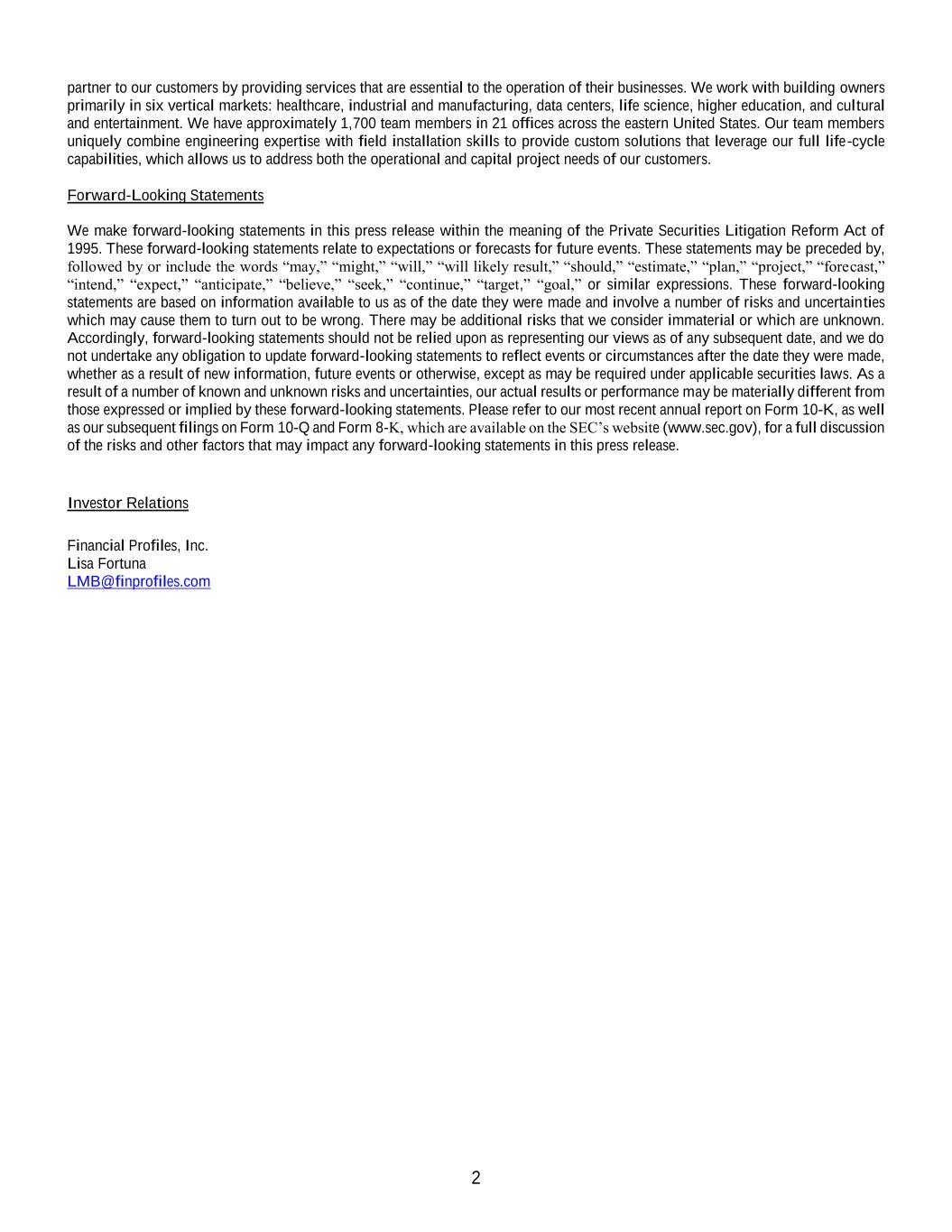 2 partner to our customers by providing services that are essential to the operation of their businesses. We work with building owners primarily in six vertical markets: healthcare, industrial and manufacturing, data centers, life science, higher education, and cultural and entertainment. We have approximately 1,700 team members in 21 offices across the eastern United States. Our team members uniquely combine engineering expertise with field installation skills to provide custom solutions that leverage our full life-cycle capabilities, which allows us to address both the operational and capital project needs of our customers. Forward-Looking Statements We make forward-looking statements in this press release within the meaning of the Private Securities Litigation Reform Act of 1995. These forward-looking statements relate to expectations or forecasts for future events. These statements may be preceded by, followed by or include the words “may,” “might,” “will,” “will likely result,” “should,” “estimate,” “plan,” “project,” “forecast,” “intend,” “expect,” “anticipate,” “believe,” “seek,” “continue,” “target,” “goal,” or similar expressions. These forward-looking statements are based on information available to us as of the date they were made and involve a number of risks and uncertainties which may cause them to turn out to be wrong. There may be additional risks that we consider immaterial or which are unknown. Accordingly, forward-looking statements should not be relied upon as representing our views as of any subsequent date, and we do not undertake any obligation to update forward-looking statements to reflect events or circumstances after the date they were made, whether as a result of new information, future events or otherwise, except as may be required under applicable securities laws. As a result of a number of known and unknown risks and uncertainties, our actual results or performance may be materially different from those expressed or implied by these forward-looking statements. Please refer to our most recent annual report on Form 10-K, as well as our subsequent filings on Form 10-Q and Form 8-K, which are available on the SEC’s website (www.sec.gov), for a full discussion of the risks and other factors that may impact any forward-looking statements in this press release. Investor Relations Financial Profiles, Inc. Lisa Fortuna LMB@finprofiles.com