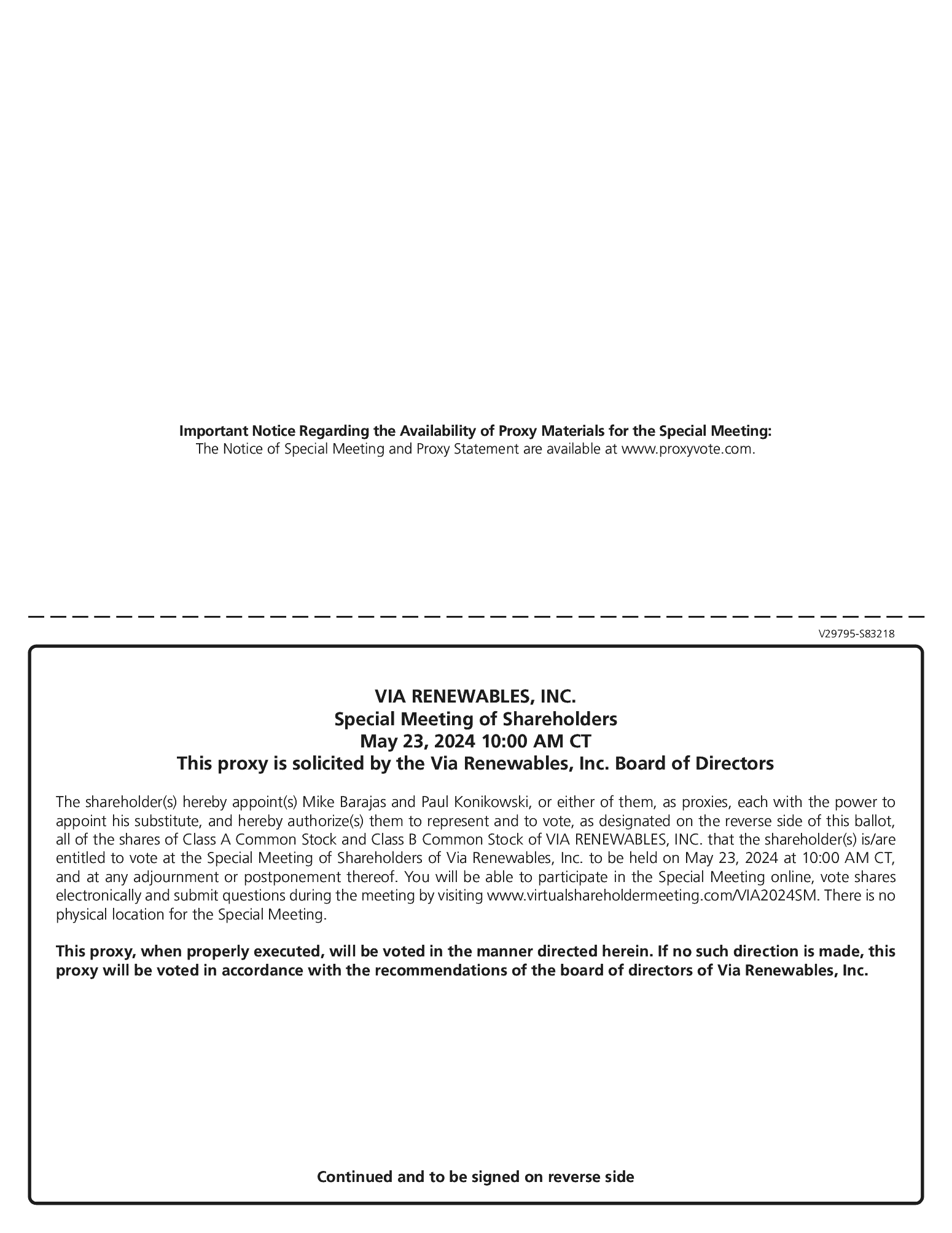 You are cordially invited to attend a special meeting (the “Special Meeting”) of the shareholders of Via Renewables, Inc. (the “Company”). The Special Meeting will be held at 10:00 AM, Central Time, on Thursday, May 23, 2024. You will be able to attend the Special Meeting, vote, and submit your questions during the Special Meeting via live webcast by visiting www.virtualshareholdermeeting.com/VIA2024SM. To attend the Special Meeting via live webcast, you must have your sixteen-digit control number that is shown on the proxy card accompanying the enclosed proxy statement. You will not be able to attend the Special Meeting in person. Formal notice of the Special Meeting, a proxy statement, and a proxy card and voting instruction card accompany this letter.