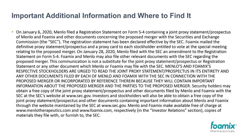 Important Additional Information and Where to Find ItOn January 6, 2020, Menlo filed a Registration Statement on Form S-4 containing a joint proxy statement/prospectus of Menlo and Foamix and other documents concerning the proposed merger with the Securities and Exchange Commission (the “SEC”). The registration statement has been declared effective by the SEC. Foamix mailed the definitive proxy statement/prospectus and a proxy card to each stockholder entitled to vote at the special meeting relating to the proposed merger. On January 28, 2020, Menlo filed with the SEC an amendment to the Registration Statement on Form S-4. Foamix and Menlo may also file other relevant documents with the SEC regarding the proposed merger. This communication is not a substitute for the joint proxy statement/prospectus or Registration Statement or any other document which Menlo or Foamix may file with the SEC. MENLO’S AND FOAMIX’S RESPECTIVE STOCKHOLDERS ARE URGED TO READ THE JOINT PROXY STATEMENT/PROSPECTUS IN ITS ENTIRETY AND ANY OTHER DOCUMENTS FILED BY EACH OF MENLO AND FOAMIX WITH THE SEC IN CONNECTION WITH THE PROPOSED MERGER OR INCORPORATED BY REFERENCE THEREIN BECAUSE THEY WILL CONTAIN IMPORTANT INFORMATION ABOUT THE PROPOSED MERGER AND THE PARTIES TO THE PROPOSED MERGER. Security holders may obtain a free copy of the joint proxy statement/prospectus and other documents filed by Menlo and Foamix with the SEC at the SEC’s website at www.sec.gov. Investors and stockholders will also be able to obtain a free copy of the joint proxy statement/prospectus and other documents containing important information about Menlo and Foamix through the website maintained by the SEC at www.sec.gov. Menlo and Foamix make available free of charge at www.menlotherapeutics.com and www.foamix.com, respectively (in the “Investor Relations” section), copies of materials they file with, or furnish to, the SEC.