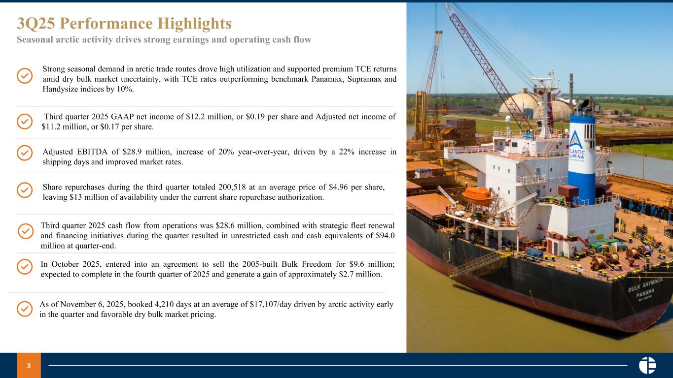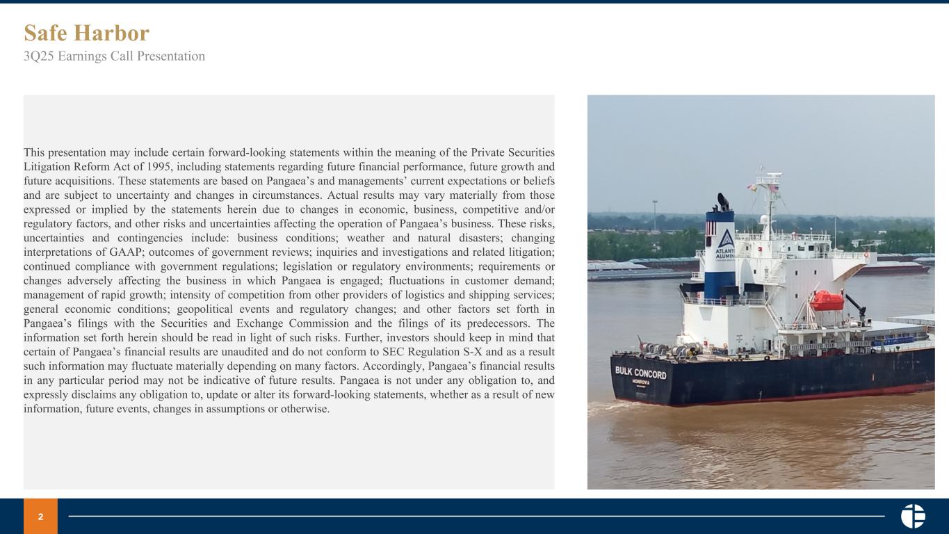 2 Safe Harbor 3Q25 Earnings Call Presentation This presentation may include certain forward-looking statements within the meaning of the Private Securities Litigation Reform Act of 1995, including statements regarding future financial performance, future growth and future acquisitions. These statements are based on Pangaea’s and managements’ current expectations or beliefs and are subject to uncertainty and changes in circumstances. Actual results may vary materially from those expressed or implied by the statements herein due to changes in economic, business, competitive and/or regulatory factors, and other risks and uncertainties affecting the operation of Pangaea’s business. These risks, uncertainties and contingencies include: business conditions; weather and natural disasters; changing interpretations of GAAP; outcomes of government reviews; inquiries and investigations and related litigation; continued compliance with government regulations; legislation or regulatory environments; requirements or changes adversely affecting the business in which Pangaea is engaged; fluctuations in customer demand; management of rapid growth; intensity of competition from other providers of logistics and shipping services; general economic conditions; geopolitical events and regulatory changes; and other factors set forth in Pangaea’s filings with the Securities and Exchange Commission and the filings of its predecessors. The information set forth herein should be read in light of such risks. Further, investors should keep in mind that certain of Pangaea’s financial results are unaudited and do not conform to SEC Regulation S-X and as a result such information may fluctuate materially depending on many factors. Accordingly, Pangaea’s financial results in any particular period may not be indicative of future results. Pangaea is not under any obligation to, and expressly disclaims any obligation to, update or alter its forward-looking statements, whether as a result of new information, future events, changes in assumptions or otherwise.