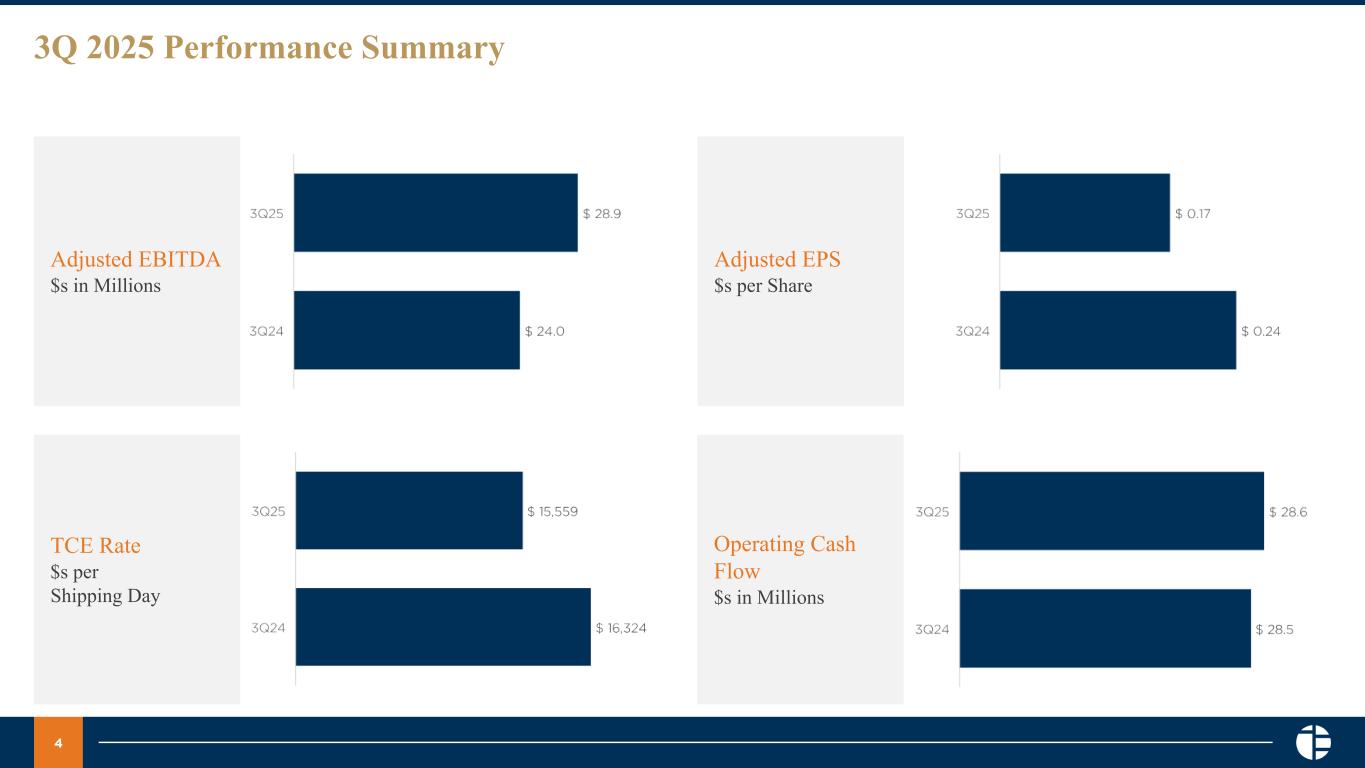 3 3Q25 Performance Highlights Seasonal arctic activity drives strong earnings and operating cash flow Strong seasonal demand in arctic trade routes drove high utilization and supported premium TCE returns amid dry bulk market uncertainty, with TCE rates outperforming benchmark Panamax, Supramax and Handysize indices by 10%. Adjusted EBITDA of $28.9 million, increase of 20% year-over-year, driven by a 22% increase in shipping days and improved market rates. Third quarter 2025 cash flow from operations was $28.6 million, combined with strategic fleet renewal and financing initiatives during the quarter resulted in unrestricted cash and cash equivalents of $94.0 million at quarter-end. As of November 6, 2025, booked 4,210 days at an average of $17,107/day driven by arctic activity early in the quarter and favorable dry bulk market pricing. In October 2025, entered into an agreement to sell the 2005-built Bulk Freedom for $9.6 million; expected to complete in the fourth quarter of 2025 and generate a gain of approximately $2.7 million. Third quarter 2025 GAAP net income of $12.2 million, or $0.19 per share and Adjusted net income of $11.2 million, or $0.17 per share. Share repurchases during the third quarter totaled 200,518 at an average price of $4.96 per share, leaving $13 million of availability under the current share repurchase authorization.