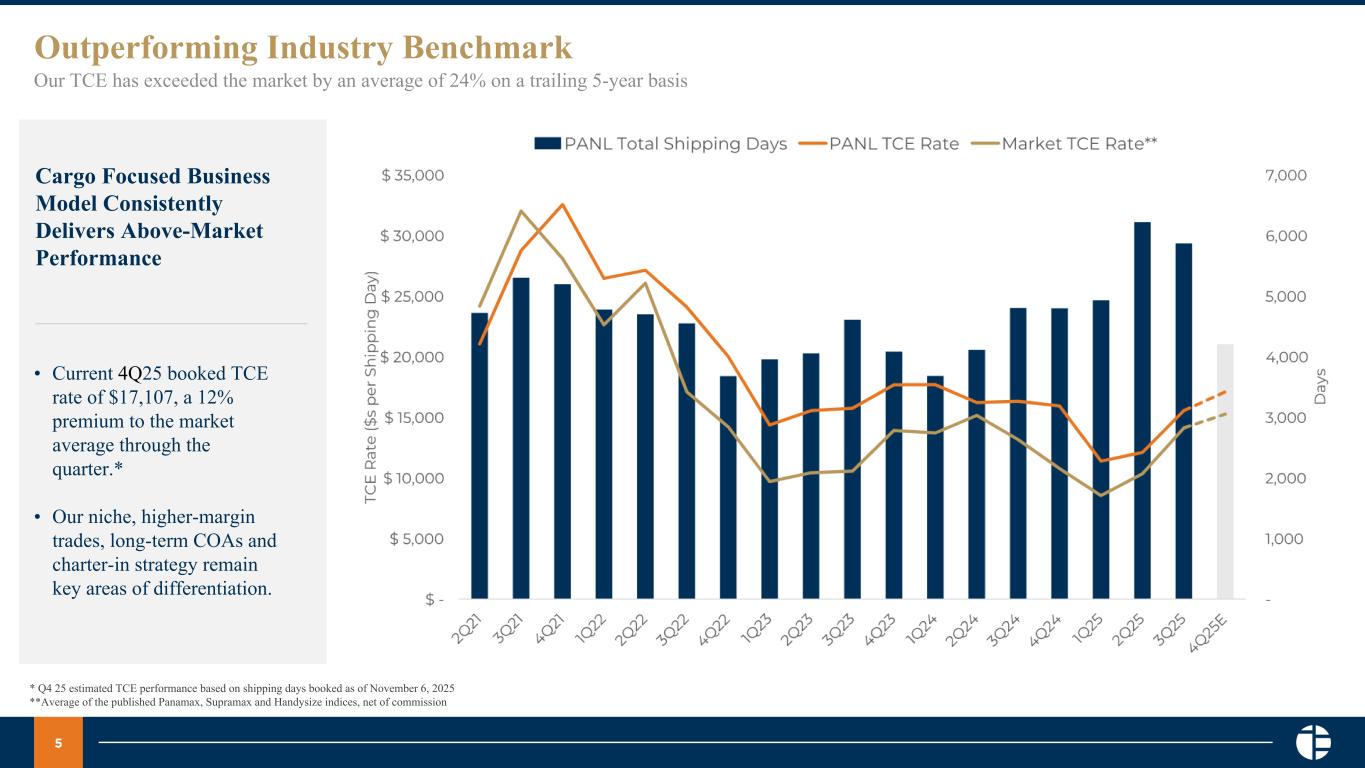 4 3Q 2025 Performance Summary Adjusted EBITDA $s in Millions Adjusted EPS $s per Share TCE Rate $s per Shipping Day Operating Cash Flow $s in Millions