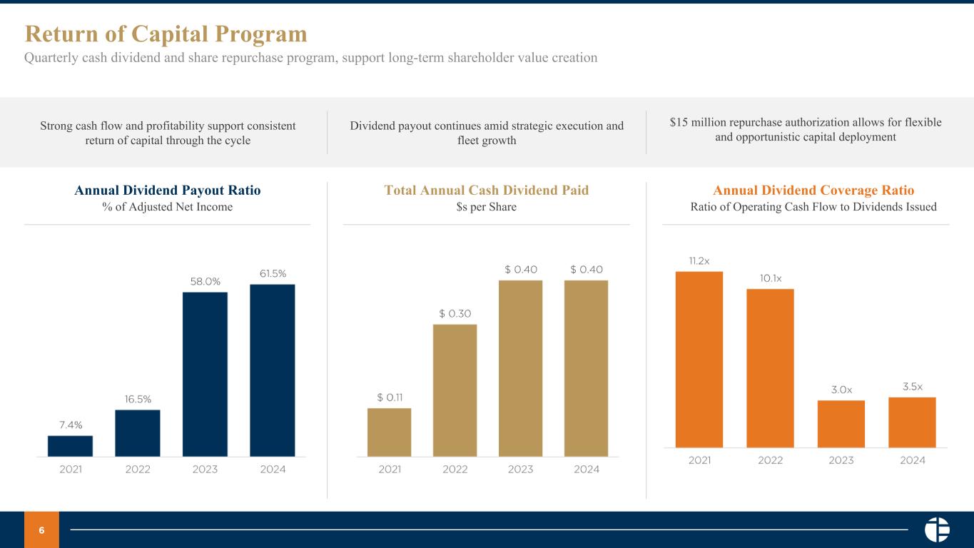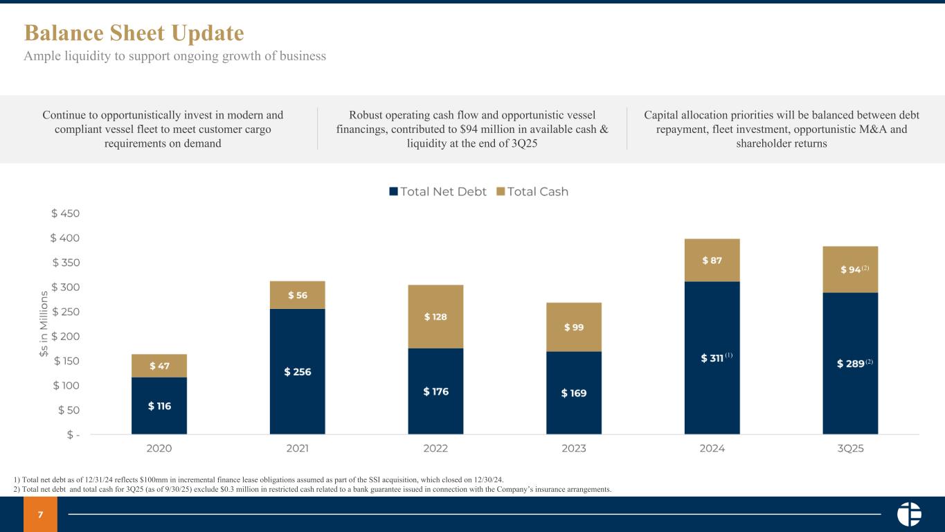 6 Return of Capital Program Quarterly cash dividend and share repurchase program, support long-term shareholder value creation Annual Dividend Payout Ratio % of Adjusted Net Income Total Annual Cash Dividend Paid $s per Share Annual Dividend Coverage Ratio Ratio of Operating Cash Flow to Dividends Issued Strong cash flow and profitability support consistent return of capital through the cycle Dividend payout continues amid strategic execution and fleet growth $15 million repurchase authorization allows for flexible and opportunistic capital deployment