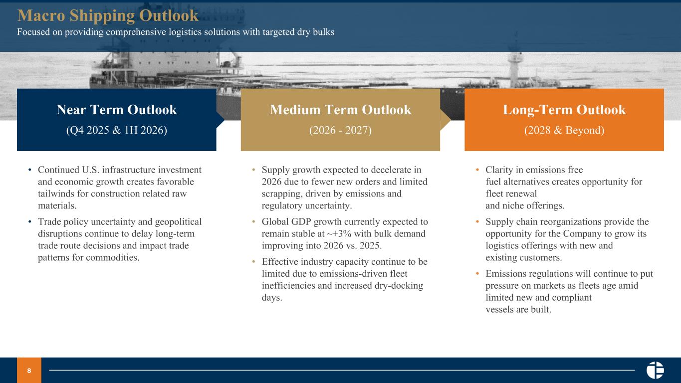 7 Balance Sheet Update Ample liquidity to support ongoing growth of business Continue to opportunistically invest in modern and compliant vessel fleet to meet customer cargo requirements on demand Robust operating cash flow and opportunistic vessel financings, contributed to $94 million in available cash & liquidity at the end of 3Q25 Capital allocation priorities will be balanced between debt repayment, fleet investment, opportunistic M&A and shareholder returns 1) Total net debt as of 12/31/24 reflects $100mm in incremental finance lease obligations assumed as part of the SSI acquisition, which closed on 12/30/24. 2) Total net debt and total cash for 3Q25 (as of 9/30/25) exclude $0.3 million in restricted cash related to a bank guarantee issued in connection with the Company’s insurance arrangements. (1) (2) (2)
