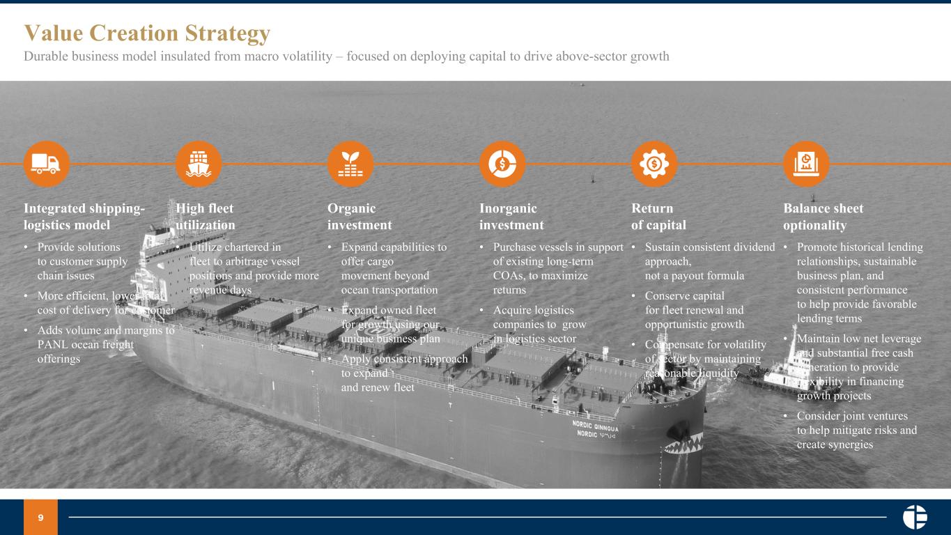 8 Macro Shipping Outlook Focused on providing comprehensive logistics solutions with targeted dry bulks Near Term Outlook (Q4 2025 & 1H 2026) Medium Term Outlook (2026 - 2027) Long-Term Outlook (2028 & Beyond) • Continued U.S. infrastructure investment and economic growth creates favorable tailwinds for construction related raw materials. • Trade policy uncertainty and geopolitical disruptions continue to delay long-term trade route decisions and impact trade patterns for commodities. • Supply growth expected to decelerate in 2026 due to fewer new orders and limited scrapping, driven by emissions and regulatory uncertainty. • Global GDP growth currently expected to remain stable at ~+3% with bulk demand improving into 2026 vs. 2025. • Effective industry capacity continue to be limited due to emissions-driven fleet inefficiencies and increased dry-docking days. • Clarity in emissions free fuel alternatives creates opportunity for fleet renewal and niche offerings. • Supply chain reorganizations provide the opportunity for the Company to grow its logistics offerings with new and existing customers. • Emissions regulations will continue to put pressure on markets as fleets age amid limited new and compliant vessels are built.