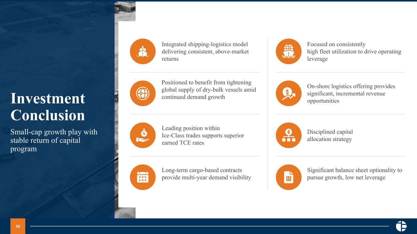 9 Value Creation Strategy Durable business model insulated from macro volatility – focused on deploying capital to drive above-sector growth Integrated shipping- logistics model • Provide solutions to customer supply chain issues • More efficient, lower total cost of delivery for customer • Adds volume and margins to PANL ocean freight offerings High fleet utilization • Utilize chartered in fleet to arbitrage vessel positions and provide more revenue days Organic investment • Expand capabilities to offer cargo movement beyond ocean transportation • Expand owned fleet for growth using our unique business plan • Apply consistent approach to expand and renew fleet Inorganic investment • Purchase vessels in support of existing long-term COAs, to maximize returns • Acquire logistics companies to grow in logistics sector Return of capital • Sustain consistent dividend approach, not a payout formula • Conserve capital for fleet renewal and opportunistic growth • Compensate for volatility of sector by maintaining reasonable liquidity Balance sheet optionality • Promote historical lending relationships, sustainable business plan, and consistent performance to help provide favorable lending terms • Maintain low net leverage and substantial free cash generation to provide flexibility in financing growth projects • Consider joint ventures to help mitigate risks and create synergies