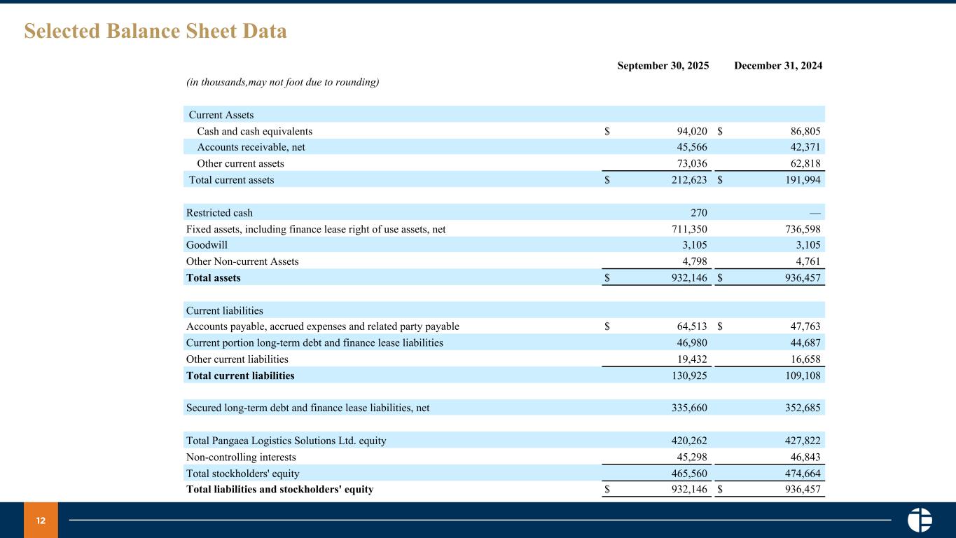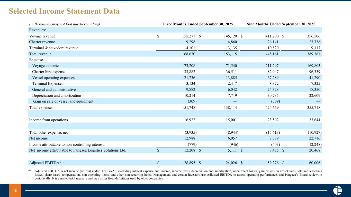 12 Selected Balance Sheet Data September 30, 2025 December 31, 2024 (in thousands,may not foot due to rounding) Current Assets Cash and cash equivalents $ 94,020 $ 86,805 Accounts receivable, net 45,566 42,371 Other current assets 73,036 62,818 Total current assets $ 212,623 $ 191,994 Restricted cash 270 — Fixed assets, including finance lease right of use assets, net 711,350 736,598 Goodwill 3,105 3,105 Other Non-current Assets 4,798 4,761 Total assets $ 932,146 $ 936,457 Current liabilities Accounts payable, accrued expenses and related party payable $ 64,513 $ 47,763 Current portion long-term debt and finance lease liabilities 46,980 44,687 Other current liabilities 19,432 16,658 Total current liabilities 130,925 109,108 Secured long-term debt and finance lease liabilities, net 335,660 352,685 Total Pangaea Logistics Solutions Ltd. equity 420,262 427,822 Non-controlling interests 45,298 46,843 Total stockholders' equity 465,560 474,664 Total liabilities and stockholders' equity $ 932,146 $ 936,457