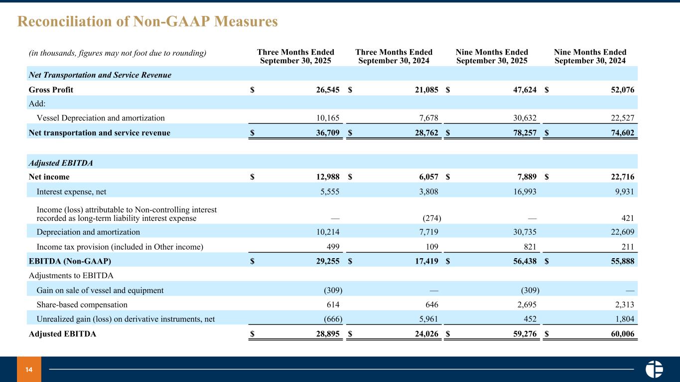 14 Reconciliation of Non-GAAP Measures (in thousands, figures may not foot due to rounding) Three Months Ended September 30, 2025 Three Months Ended September 30, 2024 Nine Months Ended September 30, 2025 Nine Months Ended September 30, 2024 Net Transportation and Service Revenue Gross Profit $ 26,545 $ 21,085 $ 47,624 $ 52,076 Add: Vessel Depreciation and amortization 10,165 7,678 30,632 22,527 Net transportation and service revenue $ 36,709 $ 28,762 $ 78,257 $ 74,602 Adjusted EBITDA Net income $ 12,988 $ 6,057 $ 7,889 $ 22,716 Interest expense, net 5,555 3,808 16,993 9,931 Income (loss) attributable to Non-controlling interest recorded as long-term liability interest expense — (274) — 421 Depreciation and amortization 10,214 7,719 30,735 22,609 Income tax provision (included in Other income) 499 109 821 211 EBITDA (Non-GAAP) $ 29,255 $ 17,419 $ 56,438 $ 55,888 Adjustments to EBITDA Gain on sale of vessel and equipment (309) — (309) — Share-based compensation 614 646 2,695 2,313 Unrealized gain (loss) on derivative instruments, net (666) 5,961 452 1,804 Adjusted EBITDA $ 28,895 $ 24,026 $ 59,276 $ 60,006