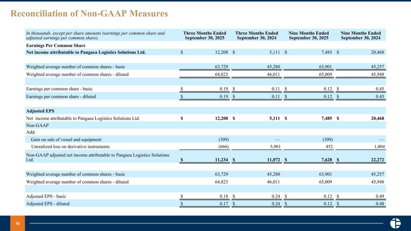 15 Reconciliation of Non-GAAP Measures In thousands, except per share amounts (earnings per common share and adjusted earnings per common share). Three Months Ended September 30, 2025 Three Months Ended September 30, 2024 Nine Months Ended September 30, 2025 Nine Months Ended September 30, 2024 Earnings Per Common Share Net income attributable to Pangaea Logistics Solutions Ltd. $ 12,208 $ 5,111 $ 7,485 $ 20,468 Weighted average number of common shares - basic 63,729 45,280 63,901 45,257 Weighted average number of common shares - diluted 64,823 46,011 65,009 45,948 Earnings per common share - basic $ 0.19 $ 0.11 $ 0.12 $ 0.45 Earnings per common share - diluted $ 0.19 $ 0.11 $ 0.12 $ 0.45 Adjusted EPS Net income attributable to Pangaea Logistics Solutions Ltd. $ 12,208 $ 5,111 $ 7,485 $ 20,468 Non-GAAP Add: Gain on sale of vessel and equipment (309) — (309) — Unrealized loss on derivative instruments (666) 5,961 452 1,804 Non-GAAP adjusted net income attributable to Pangaea Logistics Solutions Ltd. $ 11,234 $ 11,072 $ 7,628 $ 22,272 Weighted average number of common shares - basic 63,729 45,280 63,901 45,257 Weighted average number of common shares - diluted 64,823 46,011 65,009 45,948 Adjusted EPS - basic $ 0.18 $ 0.24 $ 0.12 $ 0.49 Adjusted EPS - diluted $ 0.17 $ 0.24 $ 0.12 $ 0.48