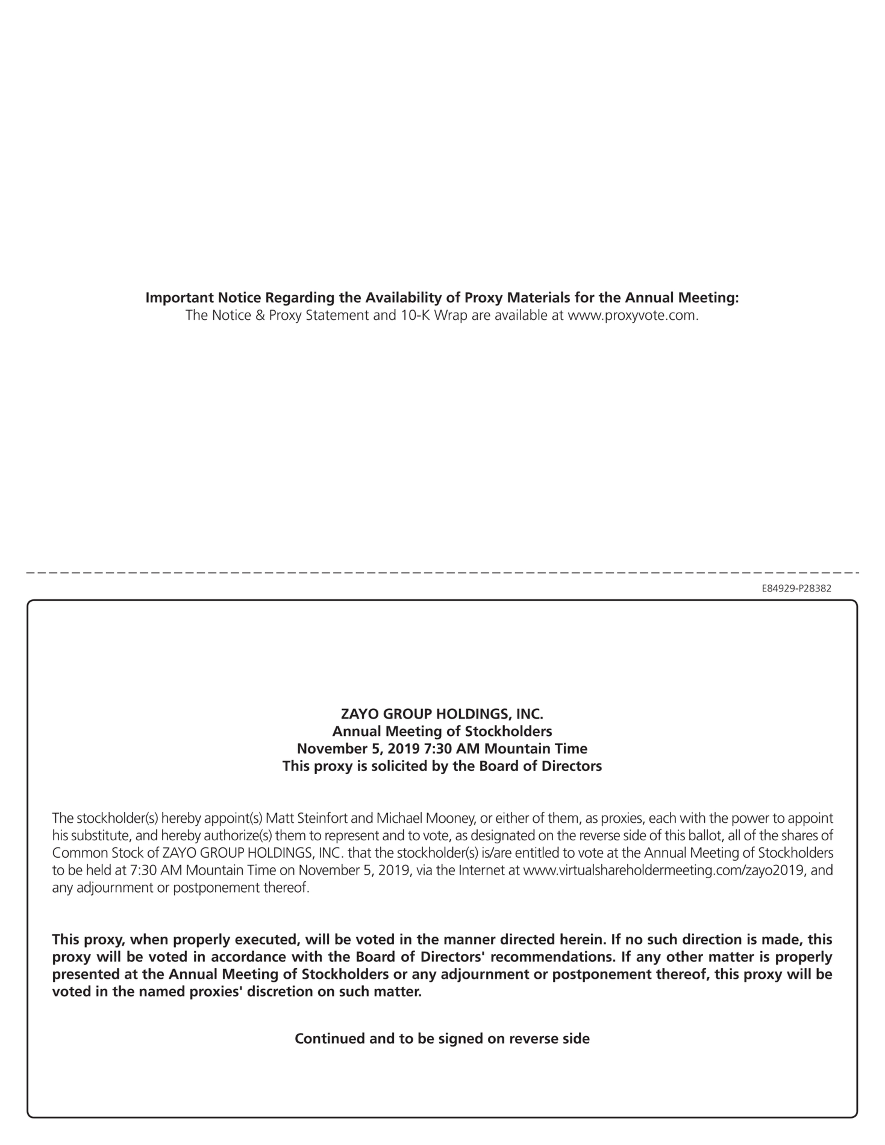 This proxy statement is furnished in connection with the solicitation of proxies by the Board of Directors (the “Board”) of Zayo Group Holdings, Inc. (“Zayo” or the “Company”) for the Annual Meeting of Stockholders of the Company to be held virtually on Tuesday, November 5, 2019, at 7:30 a.m. (Mountain Time), and any adjournment or postponement thereof (the “Annual Meeting”). The virtual Annual Meeting can be accessed by visiting www.virtualshareholdermeeting.com/zayo2019, where you will be able to listen to the meeting live, submit questions and vote online.