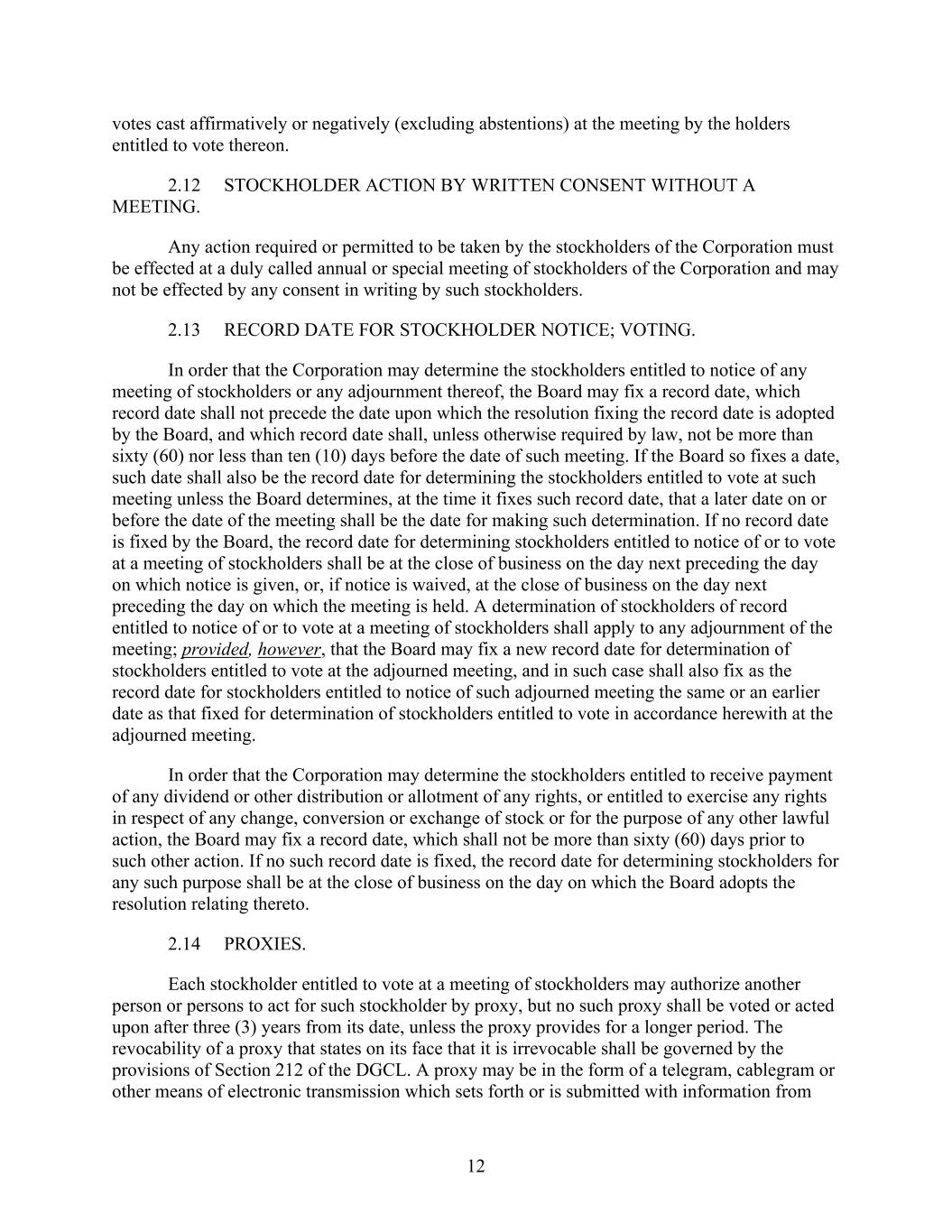 12 votes cast affirmatively or negatively (excluding abstentions) at the meeting by the holders entitled to vote thereon. 2.12 STOCKHOLDER ACTION BY WRITTEN CONSENT WITHOUT A MEETING. Any action required or permitted to be taken by the stockholders of the Corporation must be effected at a duly called annual or special meeting of stockholders of the Corporation and may not be effected by any consent in writing by such stockholders. 2.13 RECORD DATE FOR STOCKHOLDER NOTICE; VOTING. In order that the Corporation may determine the stockholders entitled to notice of any meeting of stockholders or any adjournment thereof, the Board may fix a record date, which record date shall not precede the date upon which the resolution fixing the record date is adopted by the Board, and which record date shall, unless otherwise required by law, not be more than sixty (60) nor less than ten (10) days before the date of such meeting. If the Board so fixes a date, such date shall also be the record date for determining the stockholders entitled to vote at such meeting unless the Board determines, at the time it fixes such record date, that a later date on or before the date of the meeting shall be the date for making such determination. If no record date is fixed by the Board, the record date for determining stockholders entitled to notice of or to vote at a meeting of stockholders shall be at the close of business on the day next preceding the day on which notice is given, or, if notice is waived, at the close of business on the day next preceding the day on which the meeting is held. A determination of stockholders of record entitled to notice of or to vote at a meeting of stockholders shall apply to any adjournment of the meeting; provided, however, that the Board may fix a new record date for determination of stockholders entitled to vote at the adjourned meeting, and in such case shall also fix as the record date for stockholders entitled to notice of such adjourned meeting the same or an earlier date as that fixed for determination of stockholders entitled to vote in accordance herewith at the adjourned meeting. In order that the Corporation may determine the stockholders entitled to receive payment of any dividend or other distribution or allotment of any rights, or entitled to exercise any rights in respect of any change, conversion or exchange of stock or for the purpose of any other lawful action, the Board may fix a record date, which shall not be more than sixty (60) days prior to such other action. If no such record date is fixed, the record date for determining stockholders for any such purpose shall be at the close of business on the day on which the Board adopts the resolution relating thereto. 2.14 PROXIES. Each stockholder entitled to vote at a meeting of stockholders may authorize another person or persons to act for such stockholder by proxy, but no such proxy shall be voted or acted upon after three (3) years from its date, unless the proxy provides for a longer period. The revocability of a proxy that states on its face that it is irrevocable shall be governed by the provisions of Section 212 of the DGCL. A proxy may be in the form of a telegram, cablegram or other means of electronic transmission which sets forth or is submitted with information from