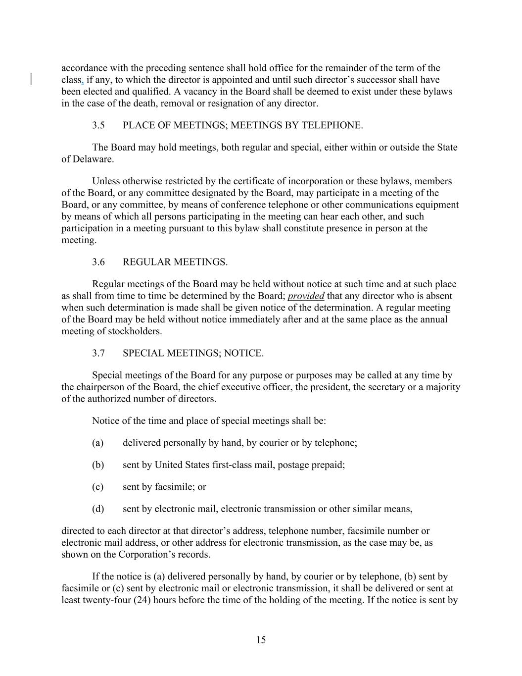 15 accordance with the preceding sentence shall hold office for the remainder of the term of the class, if any, to which the director is appointed and until such director’s successor shall have been elected and qualified. A vacancy in the Board shall be deemed to exist under these bylaws in the case of the death, removal or resignation of any director. 3.5 PLACE OF MEETINGS; MEETINGS BY TELEPHONE. The Board may hold meetings, both regular and special, either within or outside the State of Delaware. Unless otherwise restricted by the certificate of incorporation or these bylaws, members of the Board, or any committee designated by the Board, may participate in a meeting of the Board, or any committee, by means of conference telephone or other communications equipment by means of which all persons participating in the meeting can hear each other, and such participation in a meeting pursuant to this bylaw shall constitute presence in person at the meeting. 3.6 REGULAR MEETINGS. Regular meetings of the Board may be held without notice at such time and at such place as shall from time to time be determined by the Board; provided that any director who is absent when such determination is made shall be given notice of the determination. A regular meeting of the Board may be held without notice immediately after and at the same place as the annual meeting of stockholders. 3.7 SPECIAL MEETINGS; NOTICE. Special meetings of the Board for any purpose or purposes may be called at any time by the chairperson of the Board, the chief executive officer, the president, the secretary or a majority of the authorized number of directors. Notice of the time and place of special meetings shall be: (a) delivered personally by hand, by courier or by telephone; (b) sent by United States first-class mail, postage prepaid; (c) sent by facsimile; or (d) sent by electronic mail, electronic transmission or other similar means, directed to each director at that director’s address, telephone number, facsimile number or electronic mail address, or other address for electronic transmission, as the case may be, as shown on the Corporation’s records. If the notice is (a) delivered personally by hand, by courier or by telephone, (b) sent by facsimile or (c) sent by electronic mail or electronic transmission, it shall be delivered or sent at least twenty-four (24) hours before the time of the holding of the meeting. If the notice is sent by
