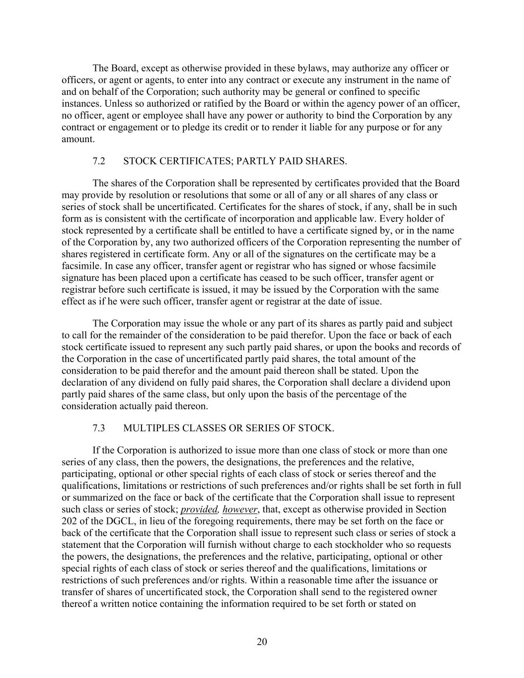 20 The Board, except as otherwise provided in these bylaws, may authorize any officer or officers, or agent or agents, to enter into any contract or execute any instrument in the name of and on behalf of the Corporation; such authority may be general or confined to specific instances. Unless so authorized or ratified by the Board or within the agency power of an officer, no officer, agent or employee shall have any power or authority to bind the Corporation by any contract or engagement or to pledge its credit or to render it liable for any purpose or for any amount. 7.2 STOCK CERTIFICATES; PARTLY PAID SHARES. The shares of the Corporation shall be represented by certificates provided that the Board may provide by resolution or resolutions that some or all of any or all shares of any class or series of stock shall be uncertificated. Certificates for the shares of stock, if any, shall be in such form as is consistent with the certificate of incorporation and applicable law. Every holder of stock represented by a certificate shall be entitled to have a certificate signed by, or in the name of the Corporation by, any two authorized officers of the Corporation representing the number of shares registered in certificate form. Any or all of the signatures on the certificate may be a facsimile. In case any officer, transfer agent or registrar who has signed or whose facsimile signature has been placed upon a certificate has ceased to be such officer, transfer agent or registrar before such certificate is issued, it may be issued by the Corporation with the same effect as if he were such officer, transfer agent or registrar at the date of issue. The Corporation may issue the whole or any part of its shares as partly paid and subject to call for the remainder of the consideration to be paid therefor. Upon the face or back of each stock certificate issued to represent any such partly paid shares, or upon the books and records of the Corporation in the case of uncertificated partly paid shares, the total amount of the consideration to be paid therefor and the amount paid thereon shall be stated. Upon the declaration of any dividend on fully paid shares, the Corporation shall declare a dividend upon partly paid shares of the same class, but only upon the basis of the percentage of the consideration actually paid thereon. 7.3 MULTIPLES CLASSES OR SERIES OF STOCK. If the Corporation is authorized to issue more than one class of stock or more than one series of any class, then the powers, the designations, the preferences and the relative, participating, optional or other special rights of each class of stock or series thereof and the qualifications, limitations or restrictions of such preferences and/or rights shall be set forth in full or summarized on the face or back of the certificate that the Corporation shall issue to represent such class or series of stock; provided, however, that, except as otherwise provided in Section 202 of the DGCL, in lieu of the foregoing requirements, there may be set forth on the face or back of the certificate that the Corporation shall issue to represent such class or series of stock a statement that the Corporation will furnish without charge to each stockholder who so requests the powers, the designations, the preferences and the relative, participating, optional or other special rights of each class of stock or series thereof and the qualifications, limitations or restrictions of such preferences and/or rights. Within a reasonable time after the issuance or transfer of shares of uncertificated stock, the Corporation shall send to the registered owner thereof a written notice containing the information required to be set forth or stated on