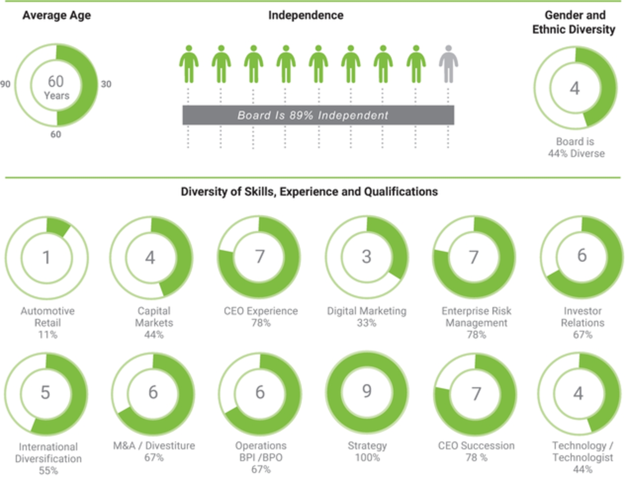 All nine of our nominees are seasoned leaders, the majority of whom are or were chief executive officers or other senior executives. Collectively, they bring to the Board a balanced mix of skills, experience, and qualifications gained during their tenure at a wide array of public companies, private companies, non-profits, and other organizations. The following graphics summarize the average age, independence, and demographic diversity of the nominees, and highlight the balanced mix of skills, experience, and qualifications of the Board as a whole. This high-level summary is not intended to be an exhaustive list of the nominees’ collective skills, experience, and qualifications, or their contributions to the Board. On the following pages we have indicated for each nominee certain of the specific skills, experience, and qualifications that led the nominating and governance committee and the Board to conclude that the nominee should continue to serve as a director.