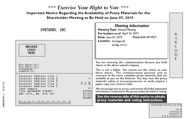0000420547_1 R1.0.1.18 *** Exercise Your Right to Vote *** Important Notice Regarding the Availability of Proxy Materials for the Shareholder Meeting to Be Held on June 07, 2019 SYNTHORX, INC. BROKER LOGO HERE Return Address Line 1 Return Address Line 2 Return Address Line 3 51 MERCEDES WAY EDGEWOOD NY 11717 Investor Address Line 1 Investor Address Line 2 Investor Address Line 3 Investor Address Line 4 Investor Address Line 5 John Sample 1234 ANYWHERE STREET ANY CITY, ON A1A 1A1 Meeting Information Meeting Type: Annual Meeting For holders as of: April 22, 2019 Date: June 07, 2019 Time: 8:00 AM PDT Location: 4401 Eastgate Mall San Diego, CA 92121 You are receiving this communication because you hold shares in the above named company. This is not a ballot. You cannot use this notice to vote these shares. This communication presents only an overview of the more complete proxy materials that are available to you on the Internet. You may view the proxy materials online at www.proxyvote.com or easily request a paper copy (see reverse side). We encourage you to access and review all of the important information contained in the proxy materials before voting. See the reverse side of this notice to obtain proxy materials and voting instructions. BARCODE Broadridge Internal Use Only Job # Envelope # Sequence # # of # Sequence # 1234567 1234567 1234567 1234567 1234567 1234567