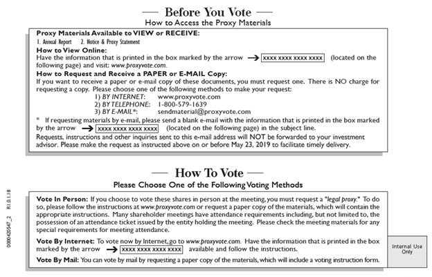 Before You Vote How to Access the Proxy Materials Proxy Materials Available to VIEW or RECEIVE: 1. Annual Report 2. Notice & Proxy Statement How to View Online: Have the information that is printed in the box marked by the arrow following page) and visit: www.proxyvote.com. How to Request and Receive a PAPER or E-MAIL Copy: (located on the If you want to receive a paper or e-mail copy of these documents, you must request one. There is NO charge for requesting a copy. Please choose one of the following methods to make your request: 1) BY INTERNET: www.proxyvote.com 2) BY TELEPHONE: 1-800-579-1639 3) BY E-MAIL*: sendmaterial@proxyvote.com * If requesting materials by e-mail, please send a blank e-mail with the information that is printed in the box marked by the arrow g (located on the following page) in the subject line. Requests, instructions and other inquiries sent to this e-mail address will NOT be forwarded to your investment advisor. Please make the request as instructed above on or before May 23, 2019 to facilitate timely delivery. How To Vote Please Choose One of the Following Voting Methods Vote In Person: If you choose to vote these shares in person at the meeting, you must request a "legal proxy." To do so, please follow the instructions at www.proxyvote.com or request a paper copy of the materials, which will contain the appropriate instructions. Many shareholder meetings have attendance requirements including, but not limited to, the possession of an attendance ticket issued by the entity holding the meeting. Please check the meeting materials for any special requirements for meeting attendance. Vote By Internet: To vote now by Internet, go to www.proxyvote.com. Have the information that is printed in the box marked by the arrow g available and follow the instructions. Vote By Mail: You can vote by mail by requesting a paper copy of the materials, which will include a voting instruction form. 0000420547_2 R1.0.1.18 Internal Use Only