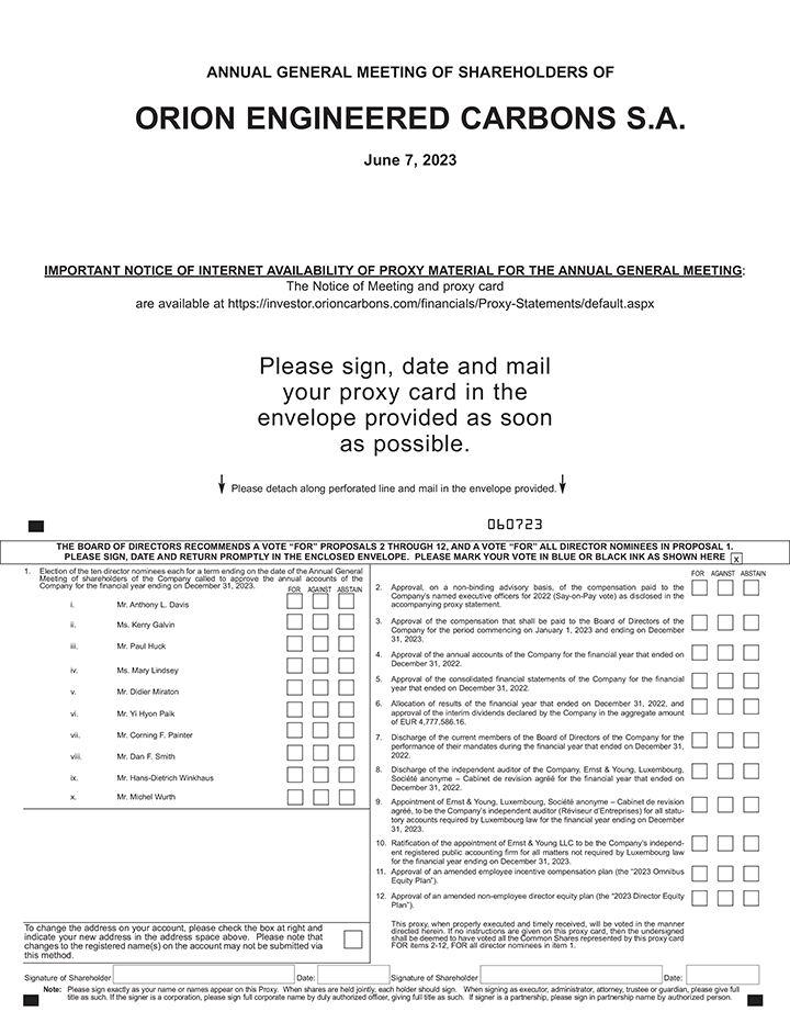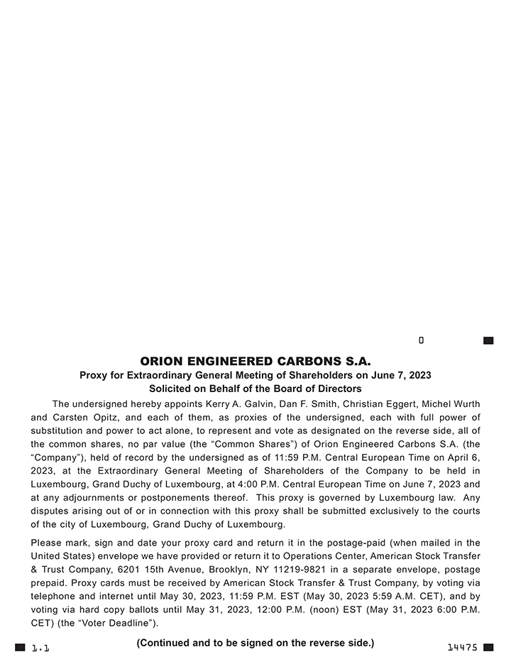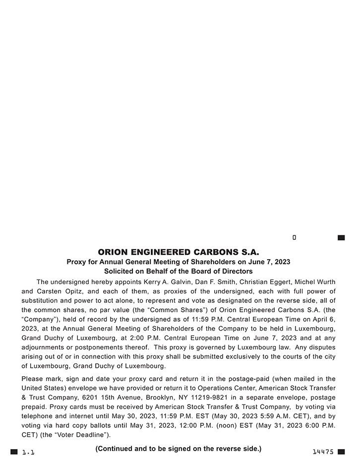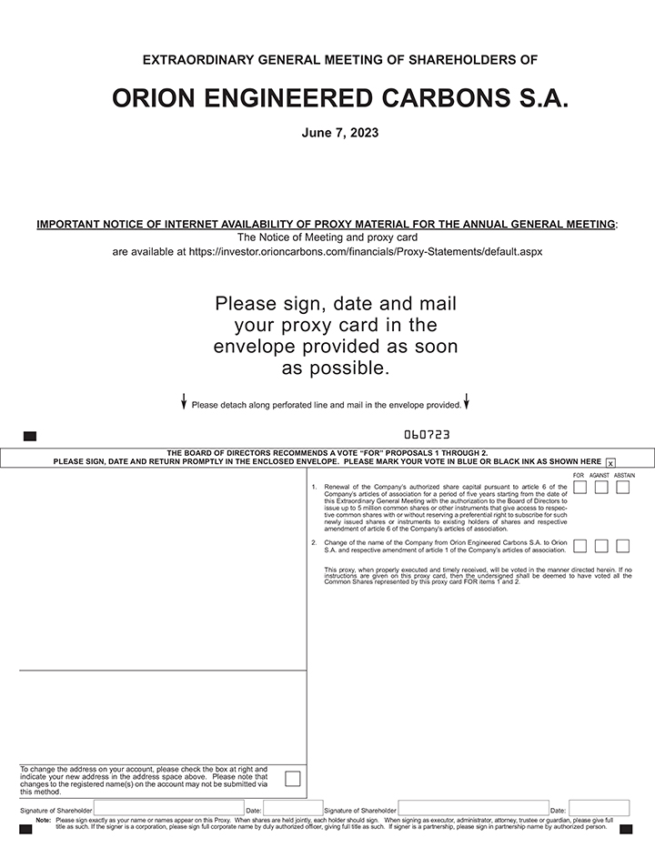The Board of Directors (the “Board of Directors” or “Board”) of Orion Engineered Carbons S.A., a société anonyme having its registered office at 6, Route de Trèves, L-2633 Senningerberg (Municipality of Niederanven), Grand Duchy of Luxembourg, registered with the Luxembourg Trade and Companies Register under registration number B 160558 (the “Company”), convened, in accordance with the provisions of article 10 of the articles of association of the Company, an Annual General Meeting of the Shareholders (the “Annual General Meeting”). You are cordially invited to attend our 2023 Annual General Meeting of Shareholders, which will be held at 2:00 p.m. Central European Time (“CET”) on June 7, 2023, at the Company’s headquarters at 6, Route de Trèves, L-2633 Senningerberg (Municipality of Niederanven), Grand Duchy of Luxembourg.