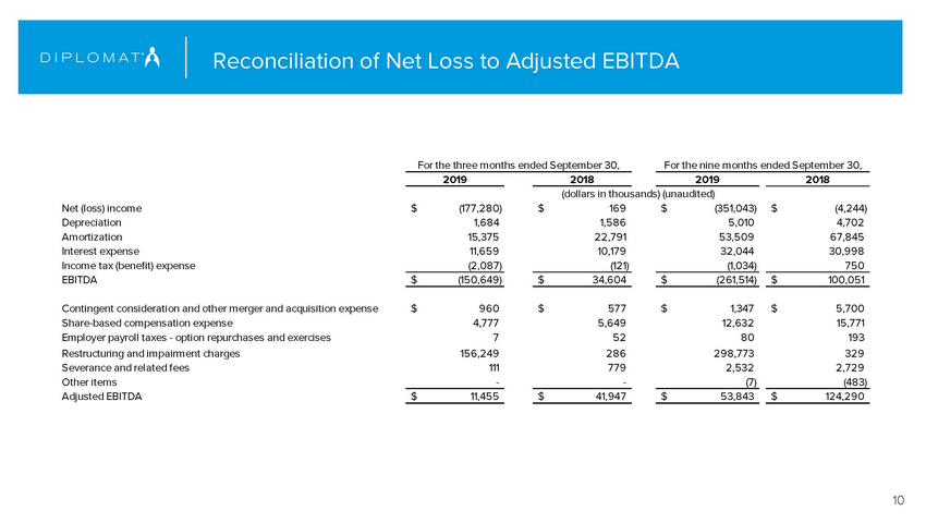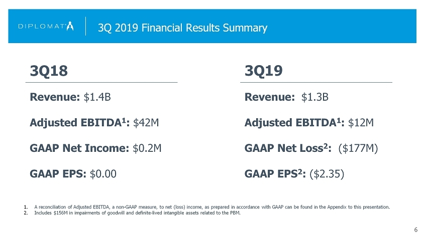 Disclaimers 2 NON - GAAP INFORMATION We define Adjusted EBITDA as net income (loss) before interest expense, income taxes, depreciation and amortization, share - based compensation, change in fair value of contingent consideration and other merger and acquisition - related expenses, restructuring and impairment charges, and certain other items that we do not consider indicative of our ongoing operating performance (which are itemized in the reconciliation to net income (loss) that can be found in the Appendix to this presentation ) . Adjusted EBITDA is not in accordance with, or an alternative to, accounting principles generally accepted in the United States (“GAAP”) . In addition, this non - GAAP measure is not based on any comprehensive set of accounting rules or principles . You should be aware that in the future we may incur expenses that are the same as or similar to some of the adjustments in the presentation, and we do not infer that our future results will be unaffected by unusual or non - recurring items . We consider Adjusted EBITDA to be a supplemental measures of our operating performance . We present Adjusted EBITDA because it is used by our Board of Directors and management to evaluate our operating performance . Adjusted EBITDA is also used as a factor in determining incentive compensation, for budgetary planning and forecasting overall financial and operational expectations, for identifying underlying trends, and for evaluating the effectiveness of our business strategies . Further, we believe it assist s us, as well as investors, in comparing performance from period - to - period on a consistent basis . Other companies in our industry may calculate Adjusted EBITDA differently than we do and these calculations may not be comparable to our Adjusted EBITDA . A reconciliation of Adjusted EBITDA, a non - GAAP measure, to net income ( loss) as prepared in accordance with GAAP can be found in the Appendix to this presentation . INDUSTRY AND MARKET DATA Certain information in this presentation concerning our industry and the markets in which we operate is derived from publicly available information released by third - party sources, including independent industry and research organizations, and management estimates . Management estimates are derived from publicly available information released by independent industry and research analysts and other third - party sources, as well as data from our internal research, and are based on assumptions made by us upon reviewing such data and our knowledge of such industry and markets, which we believe to be reasonable . We believe the data from these third - party sources is reliable . In addition, projections, assumptions, and estimates of the future performance of the industry in which we operate and our future performance are necessarily subject to uncertainty and risk due to a variety of factors, as discussed in Diplomat’s reports filed with the Securities and Exchange Commission . These and other factors could cause results to differ materially from those expressed in the estimates made by these third - party sources . FORWARD - LOOKING STATEMENT S This presentation contains forward - looking statements made pursuant to the safe harbor provisions of the Private Securities Litigation Reform Act of 1995 . Forward - looking statements give current expectations or forecasts of future events or our future financial or operating performance, and may include Diplomat’s expectations regarding revenues, net (loss) income, Adjusted EBITDA, loss per share, the strategic alternatives review process and potential transactions that may be identified and explored as a result of such review process, the expected benefits and performance of business and growth strategies, impact of operational improvement initiatives and results of operational and capital expenditures . The forward - looking statements contained in this presentation are based on management’s good - faith belief and reasonable judgment based on current information . These statements are qualified by important risks and uncertainties, many of which are beyond our control, that could cause our actual results to differ materially from those forecasted or indicated by such forward - looking statements . These risks and uncertainties include : our ability to adapt to changes or trends within the specialty pharmacy industry ; a significant increase in competition from a variety of companies in the health care industry ; significant and increasing pricing pressure from third party payors, resulting in continuing margin compression and adversely impacting contract profitability and driving our exit of certain pharmacy provider networks ; our ability to continue as a going concern ; maintaining compliance with our amended credit facility covenants ; maintaining access to our revolving line of credit ; failure to execute our plans to obtain waivers of, or mitigate potential lack of, compliance with our credit facility covenants and resulting effect of any liquidity issues ; increased financing and other costs ; failure to effectively differentiate our products and services in the PBM market place ; possibility of client losses and/or the failure to win new business ; declining gross margins in the PBM industry ; shifts in pharmacy mix toward lower margin drugs ; the ability to identify and consummate strategic alternatives that yield additional value for shareholders ; the timing, benefits and outcome of the Company’s strategic alternatives review process, including the determination of whether or not to pursue or consummate any strategic alternative ; the structure, terms and specific risks and uncertainties associated with any potential strategic transaction ; potential disruptions in our business and the stock price as a result of our exploration, review and pursuit of strategic alternatives or the public announcement thereof and any decision or transaction resulting from such re