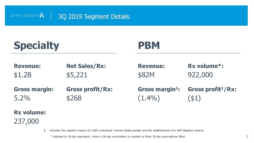 3Q 2019 Financial Results Summary 6 Revenue: $1.4B Adjusted EBITDA 1 : $42M GAAP Net Income : $0.2 M GAAP EPS: $0.00 Revenue: $ 1.3 B Adjusted EBITDA 1 : $ 12 M GAAP Net Loss 2 : ( $ 177 M) GAAP EPS 2 : ($ 2.35 ) 3Q18 3Q19 1. A reconciliation of Adjusted EBITDA, a non - GAAP measure, to net ( loss) income, as prepared in accordance with GAAP can be found in the Appendix to this presentation. 2. Includes $156M in impairments of goodwill and definite - lived intangible assets related to the PBM.
