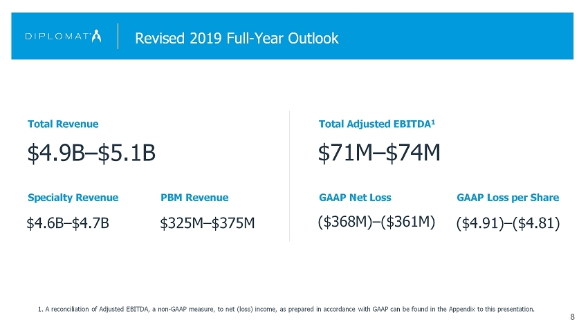3 Q 2019 Segment Details 7 Specialty PBM Revenue: $ 1.2 B Gross margin: 5.2 % Rx volume: 237,000 Net Sales/Rx: $ 5,221 Gross profit/Rx: $ 268 Revenue: $82 M Gross margin 1 : (1.4%) Rx volume*: 922,000 Gross profit 1 /Rx: ($1) * Adjusted to 30 - day equivalent, where a 90 - day prescription is counted as three 30 - day prescriptions filled. 1. Includes the negative impact of a $9M contractual volume rebate penalty and the establishment of a $4M litigation reserve.