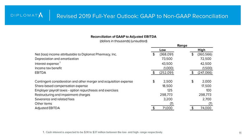 Revised 2019 Full - Year Outlook : GAAP to Non - GAAP Reconciliation 11 1. Cash interest is expected to be $38 to $37 million between the low - and high - range respectively. Low High Net (loss) income attributable to Diplomat Pharmacy, Inc. (368,091)$ (360,566)$ Depreciation and amortization 73,500 72,500 Interest expense 1 43,500 42,500 Income tax benefit (1,000) (1,500) EBITDA (252,091)$ (247,066)$ Contingent consideration and other merger and acquisition expense 2,500$ 2,000$ Share-based compensation expense 18,500 17,500 Employer payroll taxes - option repurchases and exercises 125 100 Restructuring and impairment charges 298,773 298,773 Severance and related fees 3,200 2,700 Other items (7) (7) Adjusted EBITDA 71,000$ 74,000$ Reconciliation of GAAP to Adjusted EBITDA (dollars in thousands) (unaudited) Range