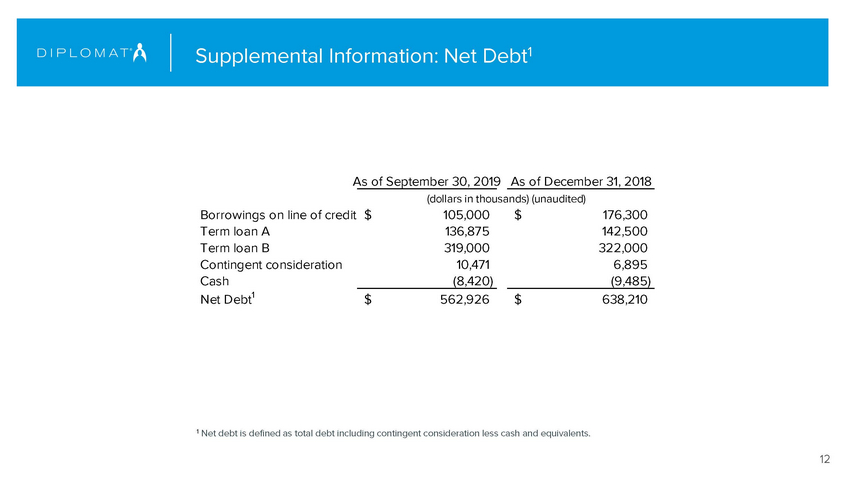 Supplemental Information: Net Debt 1 12 1 Net debt is defined as total debt including contingent consideration less cash and equivalents. As of September 30, 2019As of December 31, 2018 Borrowings on line of credit 105,000$ 176,300$ Term loan A 136,875 142,500 Term loan B 319,000 322,000 Contingent consideration 10,471 6,895 Cash (8,420) (9,485) Net Debt 1 562,926$ 638,210$ (dollars in thousands) (unaudited)