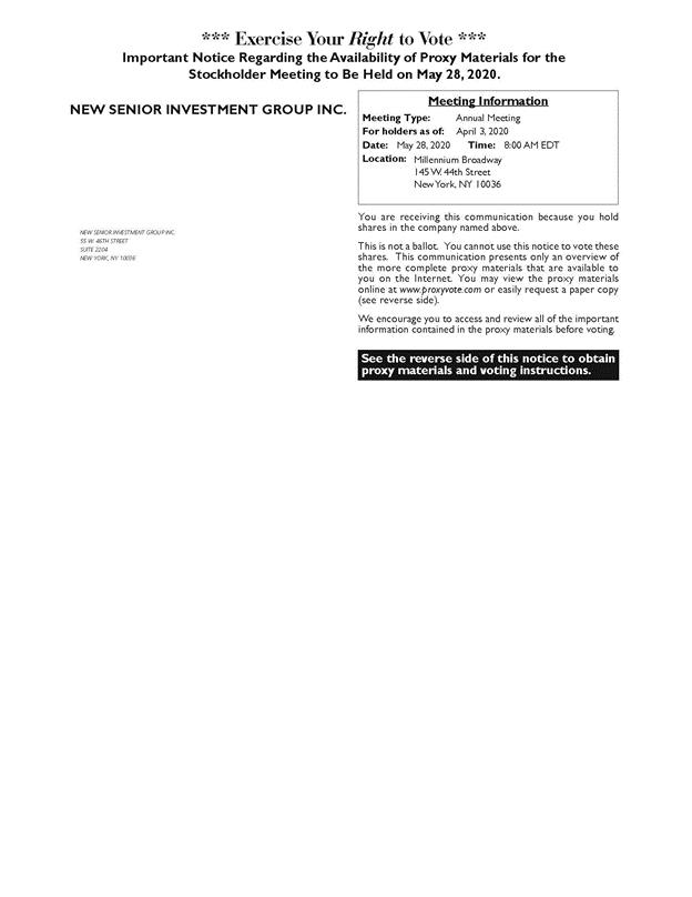 *** Exercise Your Right to Vote *** Important Notice Regarding the Availability of Proxy Materials for the Stockholder Meeting to Be Held on May 28, 2020. Meeting Information NEW SENIOR INVESTMENT GROUP INC. Meeting Type: Annual Meeting For holders as of: April 3, 2020 Date: May 28, 2020 Time: 8:00 AM EDT Location: Millennium Broadway 145 W. 44th Street New York, NY 10036 You are receiving this communication because you hold shares in the company named above. This is not a ballot. You cannot use this notice to vote these shares. This communication presents only an overview of the more complete proxy materials that are available to you on the Internet. You may view the proxy materials online at www.proxyvote.com or easily request a paper copy (see reverse side). We encourage you to access and review all of the important information contained in the proxy materials before voting. NEW SENIOR INVESTMENT GROUP INC. 55 W. 46TH STREET SUITE 2204 NEW YORK, NY 10036 See the reverse side of this notice to obtain proxy materials and voting instructions.