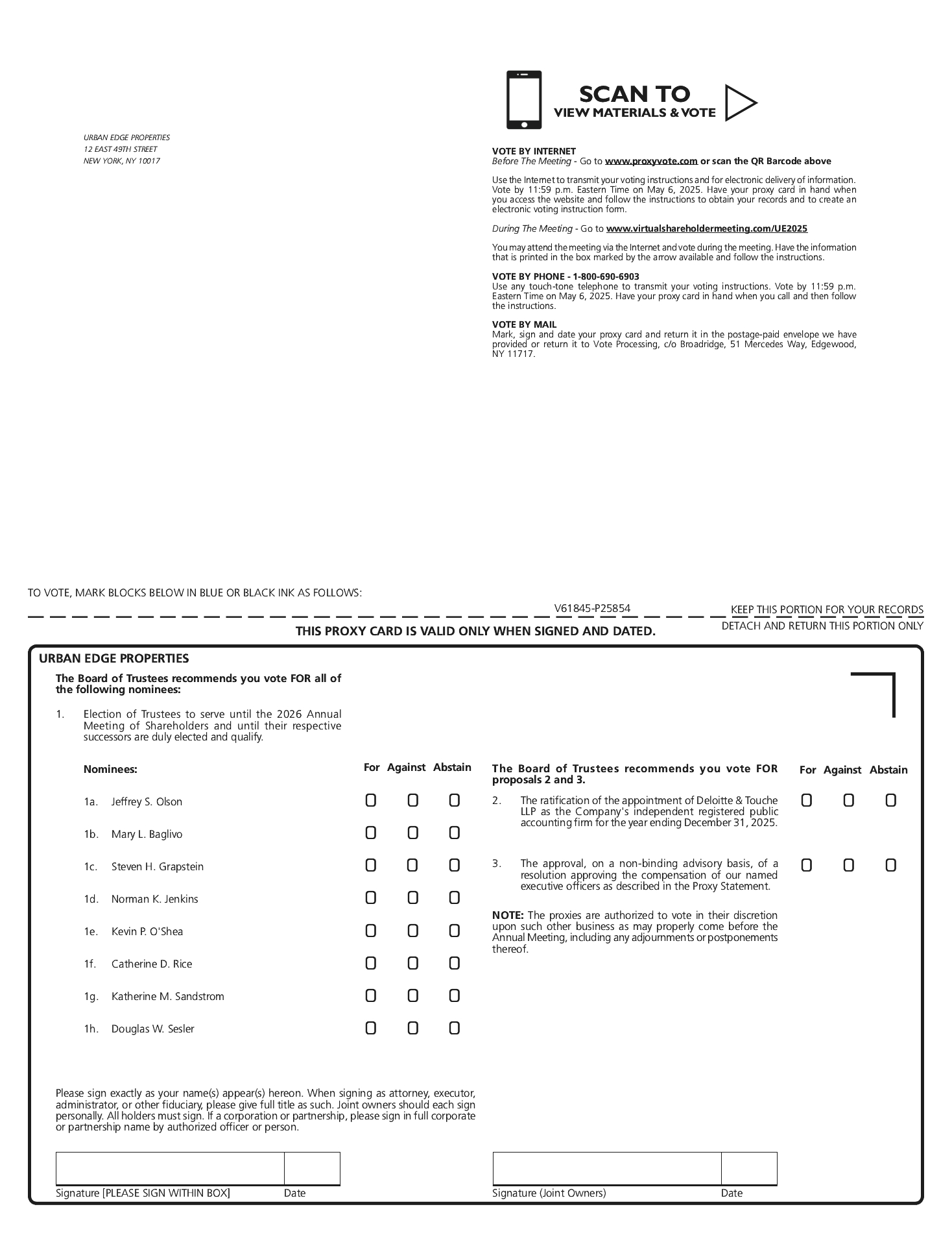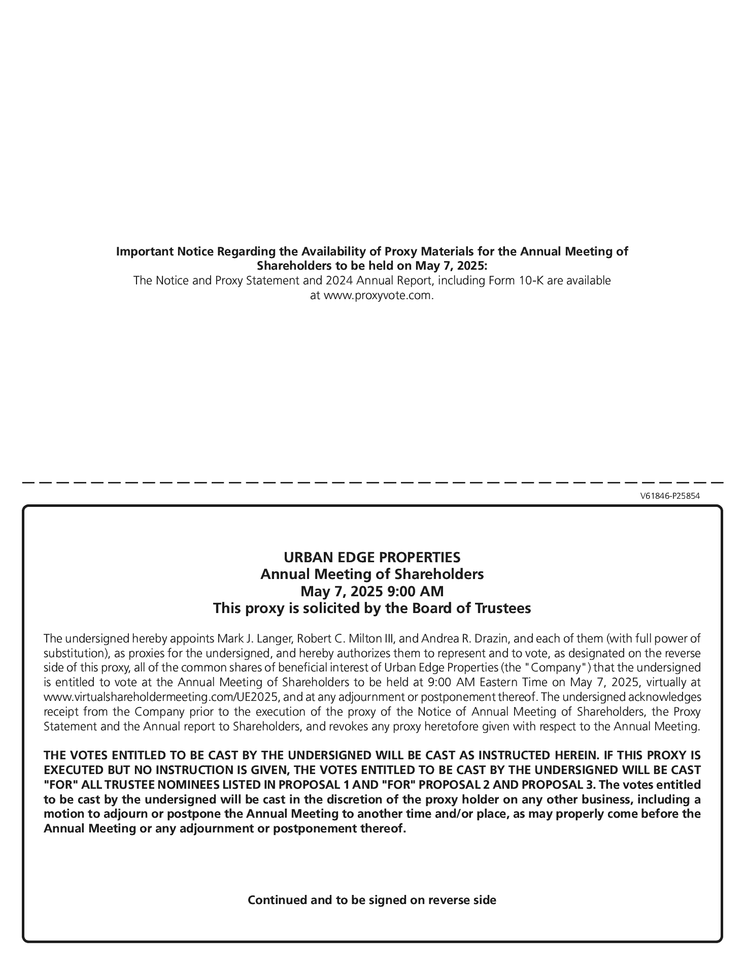Please refer to our website, which is located at www.uedge.com. Although the information contained on or available through our website is not part of this Proxy Statement, you can view additional information on the website, such as our corporate governance materials and SEC filings. Copies of these documents may be obtained free of charge by writing to Urban Edge Properties, 12 East 49th Street, 44th Floor, New York, New York 10017, Attention: Robert C. Milton III, Executive Vice President, General Counsel and Secretary.