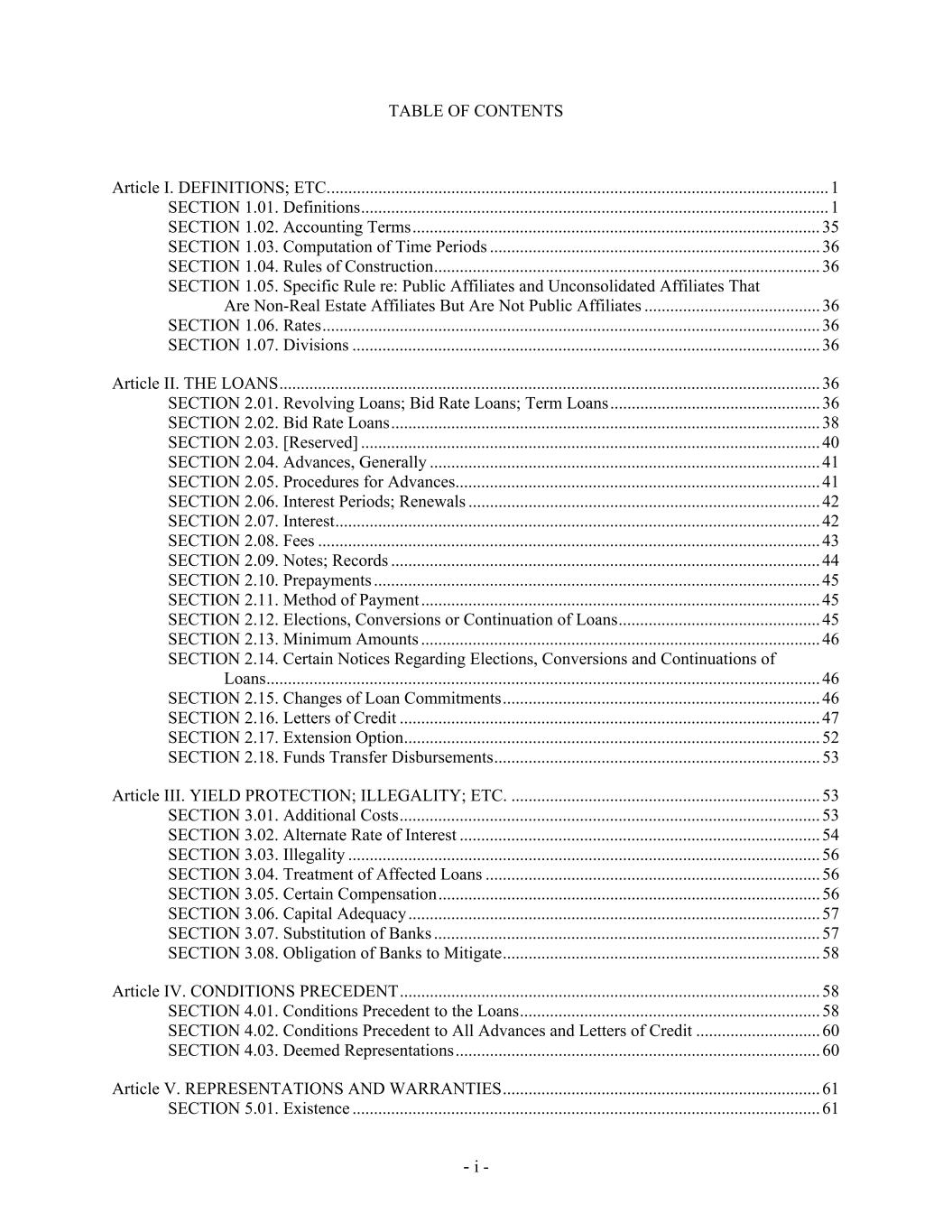 TABLE OF CONTENTS - i - Article I. DEFINITIONS; ETC. .................................................................................................................... 1 SECTION 1.01. Definitions ............................................................................................................. 1 SECTION 1.02. Accounting Terms ............................................................................................... 35 SECTION 1.03. Computation of Time Periods ............................................................................. 36 SECTION 1.04. Rules of Construction .......................................................................................... 36 SECTION 1.05. Specific Rule re: Public Affiliates and Unconsolidated Affiliates That Are Non-Real Estate Affiliates But Are Not Public Affiliates ......................................... 36 SECTION 1.06. Rates .................................................................................................................... 36 SECTION 1.07. Divisions ............................................................................................................. 36 Article II. THE LOANS .............................................................................................................................. 36 SECTION 2.01. Revolving Loans; Bid Rate Loans; Term Loans ................................................. 36 SECTION 2.02. Bid Rate Loans .................................................................................................... 38 SECTION 2.03. [Reserved] ........................................................................................................... 40 SECTION 2.04. Advances, Generally ........................................................................................... 41 SECTION 2.05. Procedures for Advances ..................................................................................... 41 SECTION 2.06. Interest Periods; Renewals .................................................................................. 42 SECTION 2.07. Interest ................................................................................................................. 42 SECTION 2.08. Fees ..................................................................................................................... 43 SECTION 2.09. Notes; Records .................................................................................................... 44 SECTION 2.10. Prepayments ........................................................................................................ 45 SECTION 2.11. Method of Payment ............................................................................................. 45 SECTION 2.12. Elections, Conversions or Continuation of Loans ............................................... 45 SECTION 2.13. Minimum Amounts ............................................................................................. 46 SECTION 2.14. Certain Notices Regarding Elections, Conversions and Continuations of Loans ................................................................................................................................. 46 SECTION 2.15. Changes of Loan Commitments .......................................................................... 46 SECTION 2.16. Letters of Credit .................................................................................................. 47 SECTION 2.17. Extension Option ................................................................................................. 52 SECTION 2.18. Funds Transfer Disbursements ............................................................................ 53 Article III. YIELD PROTECTION; ILLEGALITY; ETC. ........................................................................ 53 SECTION 3.01. Additional Costs .................................................................................................. 53 SECTION 3.02. Alternate Rate of Interest .................................................................................... 54 SECTION 3.03. Illegality .............................................................................................................. 56 SECTION 3.04. Treatment of Affected Loans .............................................................................. 56 SECTION 3.05. Certain Compensation ......................................................................................... 56 SECTION 3.06. Capital Adequacy ................................................................................................ 57 SECTION 3.07. Substitution of Banks .......................................................................................... 57 SECTION 3.08. Obligation of Banks to Mitigate .......................................................................... 58 Article IV. CONDITIONS PRECEDENT .................................................................................................. 58 SECTION 4.01. Conditions Precedent to the Loans ...................................................................... 58 SECTION 4.02. Conditions Precedent to All Advances and Letters of Credit ............................. 60 SECTION 4.03. Deemed Representations ..................................................................................... 60 Article V. REPRESENTATIONS AND WARRANTIES .......................................................................... 61 SECTION 5.01. Existence ............................................................................................................. 61